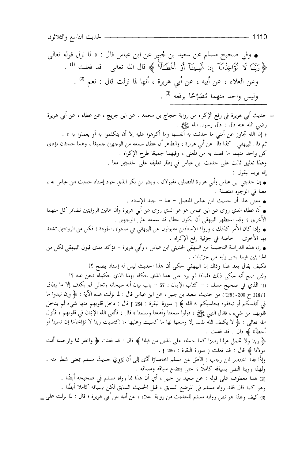 وفي " صحيح مسلم " (¬1) عن سعيد بن جُبير، عن ابن عباس، قال لما نزل قولُه تعالى {رَبَّنَا لا تُؤَاخِذْنَا إِنْ نَسِينَا أَوْ أَخْطَأْنَا} (¬2) قال الله: قد فعلتُ.