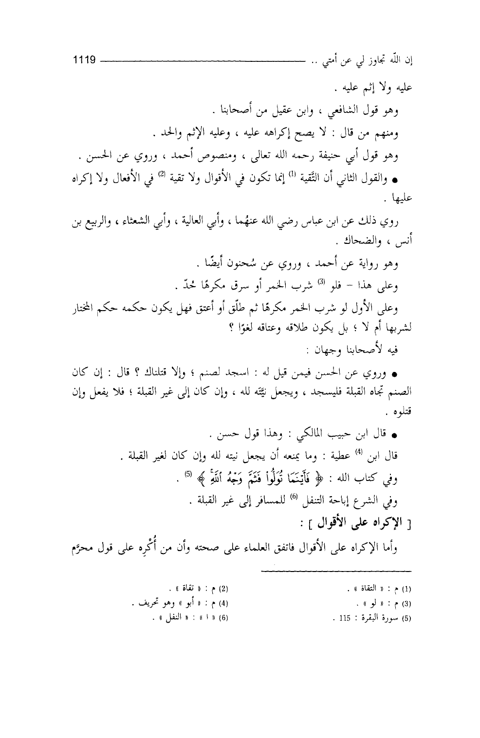 وعلى الأول لو شرب الخمر مكرهاً، ثم طلَّق أو أعتق، فهل يكون حكمُه حكمَ المختارِ لشُربِها أم لا؟ بل يكونُ طلاقُه وعِتاقه لغواً؟ فيه لأصحابنا وجهان (¬2) ، ورُوي عن الحسن فيمن قيل له: اسجُد لصنمٍ وإلاَّ قتلناك، قال: إنْ كان الصَّنمُ تجاهَ القبلة، فليسجُد، ويجعل نيَّته لله، وإنْ كان إلى غير القبلة، فلا يفعل وإنْ
