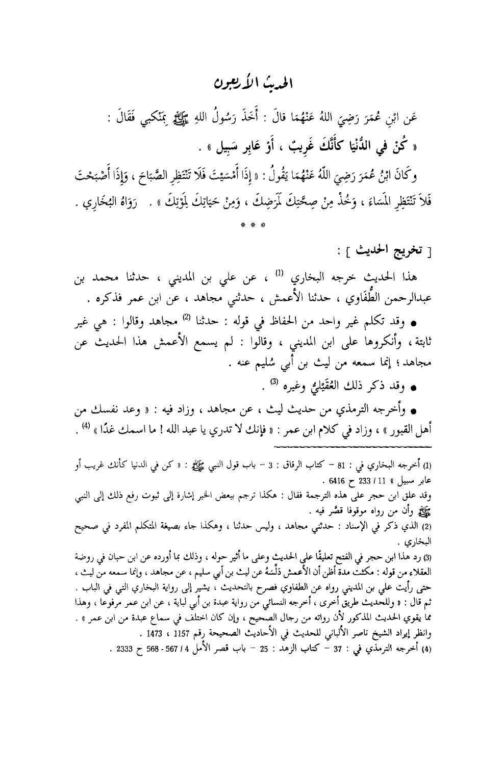 ((كُنْ فِي الدُّنيا كأَنَّكَ غَريبٌ، أو عَابِرُ سَبيلٍ)) وكانَ ابنُ عَمَر يَقولُ: إذا أَمسيتَ، فَلا تَنتَطِر الصَّباح، وإذا أَصْبَحْتَ فلا تَنتَظِرِ المساءَ، وخُذْ مِنْ صِحَّتِك لِمَرضِكَ، ومنْ حَياتِكَ لِمَوتِكَ. رواهُ البُخاريُّ.