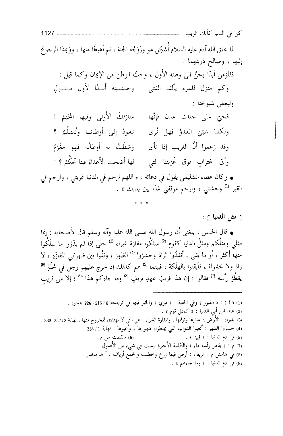 (¬1) جاء بعد هذا في النسخ المطبوعة: ((وحب الوطن من الإيمان)) ، وقد حذفته لعدم ورودها في النسخة الخطية؛ ولأنَّ هذا الكلام غير مستقيم.