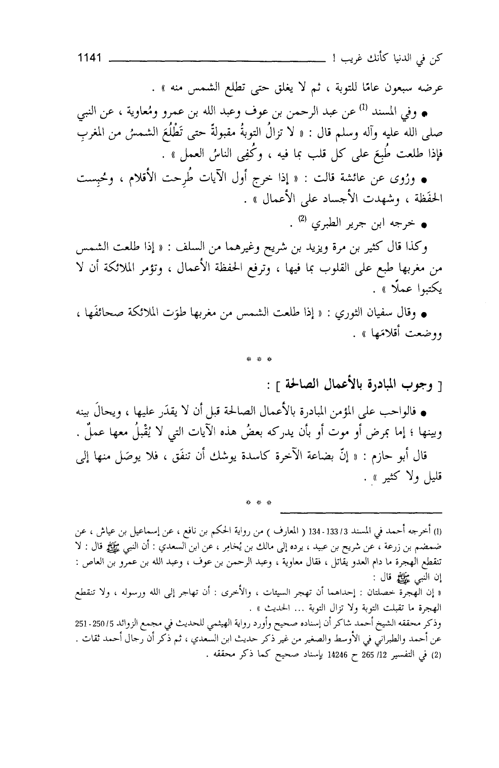 وفي " المسند " (¬1) عن عبد الرحمان بن عوف وعبد الله بن عمرو، ومعاوية، عن النَّبيِّ - صلى الله عليه وسلم -، قال: ((لا تزالُ التوبةُ مقبولةً حتّى تطلُعَ الشمسُ من المغرب، فإذا طَلَعَت طُبِعَ على كلِّ قلبٍ بما فيه، وكُفِي الناسُ العمل)) .