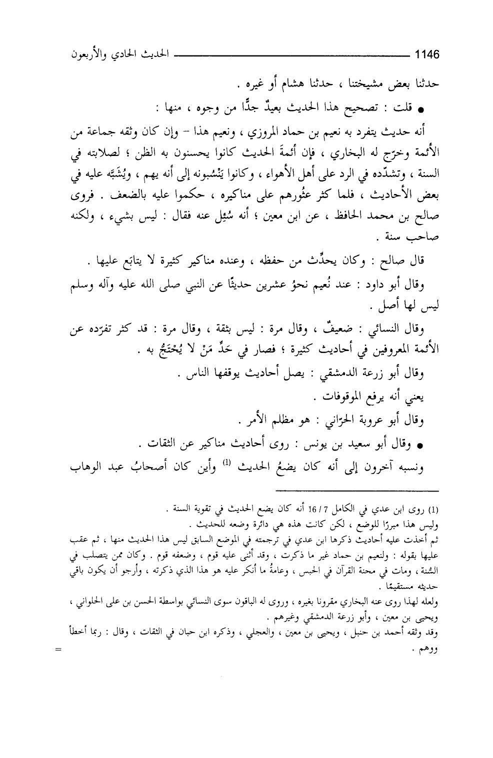 قلت: تصحيحُ هذا الحديث بعيدٌ جداً من وجوه، منها: أنَّه حديثٌ يتفرد به نُعيمُ بنُ حماد المروزي، ونُعيم هذا وإنْ كان وثَّقه جماعةٌ مِنَ الأئمة، وخرَّج له البخاري، فإنَّ أئمةَ الحديث كانوا يُحسنون به الظنَّ، لِصلابته في السُّنة، وتشدُّده في الرَّدِّ على أهل الأهواء، وكانوا ينسبونه إلى أنَّه يَهِمُ، ويُشبّه عليه في بعض الأحاديث، فلمَّا كُثرَ عثورُهم على مناكيره، حكموا عليه بالضَّعف، فروى صالح ابن محمد الحافظ عن ابن معين أنَّه سئل عنه فقال: ليس بشيء ولكنَّه صاحب سنة، قال صالح: وكان يُحدِّث من حفظه، وعنده مناكير كثيرة لا يُتابع عليها. وقال أبو داود: عند نعيم نحوُ عشرين حديثاً عن النَّبيِّ - صلى الله عليه وسلم - ليس لها أصل (¬1) ، وقال النَّسائي: ضعيف (¬2) . وقال مَرَّةً: ليس بثقة. وقال مرة: قد كثر تفرُّدُه عن الأئمة المعروفين في أحاديث كثيرةٍ، فصار في حدِّ مَنْ لا يُحتجُّ به. وقال أبو زرعة الدمشقي: يَصِلُ أحاديث يُوقِفُها الناسُ (¬3) ، يعني: أنَّه يرفع الموقوفات، وقال أبو عروبة الحراني: هو مظلمُ الأمر، وقال أبو سعيد بن يونس: روى أحاديث مناكير عن الثقات، ونسبه آخرون إلى أنّه كان يضعُ الحديثَ، وأين كان أصحاب