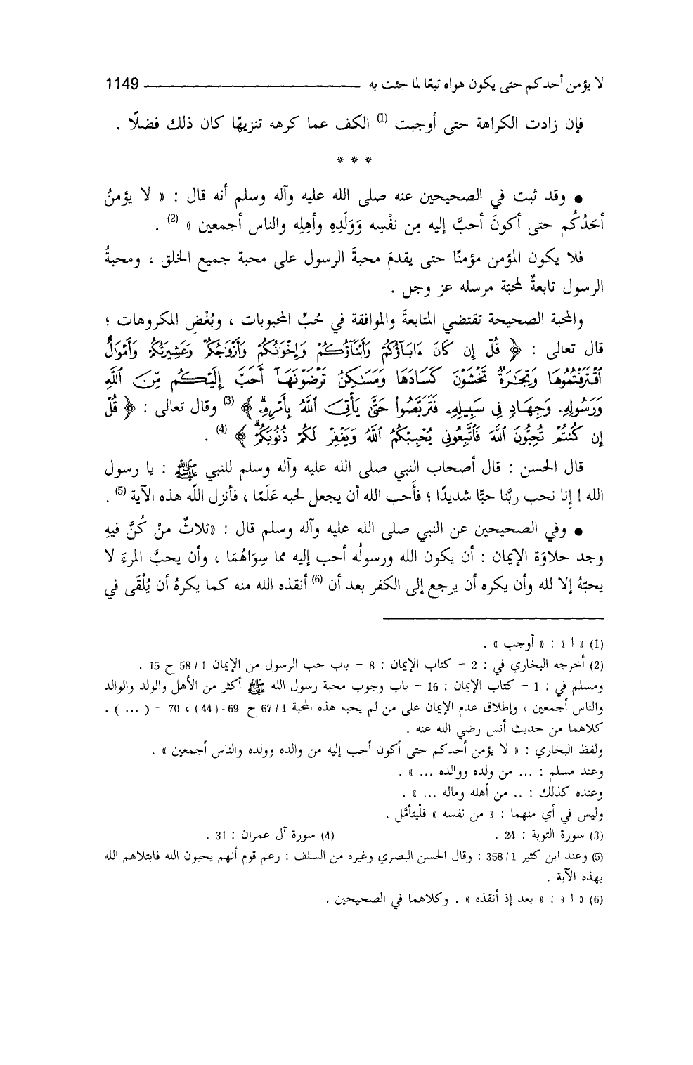 " الصحيحين " (¬1) عنه - صلى الله عليه وسلم - أنَّه قال: ((لا يؤمن أحدُكُم حتّى أكونَ أحبَّ إليه من نفسه وولده وأهله والنّاس أجمعين)) فلا يكون المؤمن مؤمناً حتى يُقدم محبة الرسول على محبة جميع الخلق، ومحبة الرسول تابعة لمحبة مرسله.