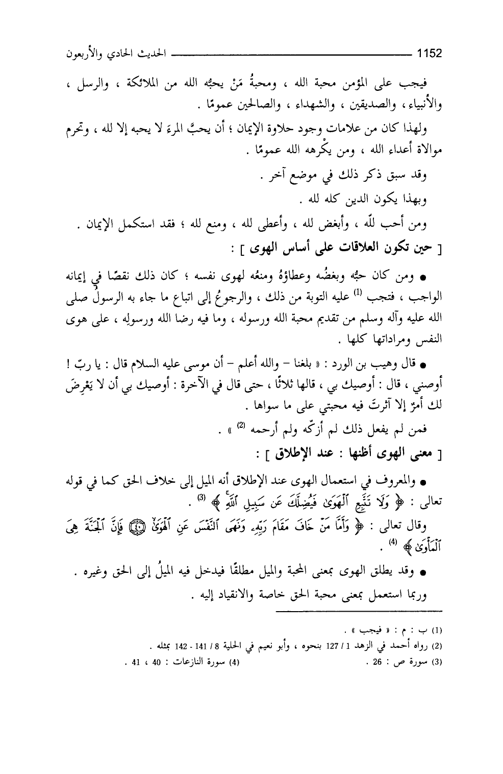 فيجبُ على المؤمن محبةُ الله ومحبةُ من يحبه الله من الملائكة والرسل والأنبياء والصديقين والشهداء والصالحين عموماً، ولهذا كان مِنْ علامات وجود حلاوة الإيمان أنْ يُحِبَّ المرءَ لا يُحبُّه إلا لله، ويُحرمُ موالاةُ أعداءِ الله. ومن يكرهه الله عموماً، وقد سبق ذلك في موضع آخر، وبهذا يكونُ الدِّينُ كلُّه لله. و ((من أحبَّ لله، وأبغض لله، وأعطى لله، ومنع لله، فقد استكمل الإيمان)) (¬1) ، ومن كان حُبُّه وبُغضه وعطاؤه ومنعه لهوى نفسه، كان ذلك نقصاً في إيمانه الواجب، فيجب عليه التَّوبةُ من ذلك، والرُّجوع إلى اتِّباع ما جاء به الرسول - صلى الله عليه وسلم - من تقديم محبة الله ورسوله، وما فيه رضا الله ورسوله على هوى النفوس ومراداتها كلها.