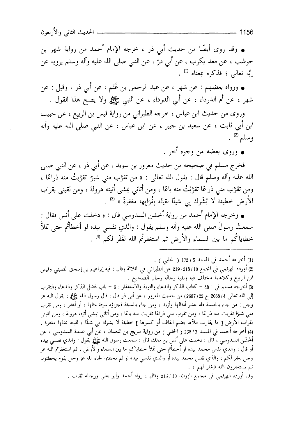 ورُوي بعضه من وجوهٍ أُخر، فخرَّج مسلم في " صحيحه " (¬5) من حديث المعرور بن سُويد، عن أبي ذرٍّ عن النَّبيِّ - صلى الله عليه وسلم -، قال: ((يقول الله تعالى: مَن تقرَّب منِّي شبراً تقرَّبت منه ذراعاً، ومن تقرَّب منِّي ذراعاً تقرَّبت منه باعاً، ومن أتاني يمشي، أتيته هرولة، ومن لقِيَني بقُرابِ الأرض خطيئةً لا يُشرِكُ بي شيئاً لقيتُه بقُرابها مغفرةً)) .