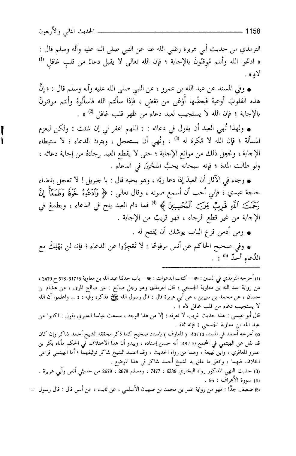 الترمذي (¬1) من حديث أبي هريرة، عن النَّبيِّ - صلى الله عليه وسلم -، قال: ((ادعوا الله وأنتم موقنون بالإجابة، فإنَّ الله لا يَقبلُ دُعاءً من قلبٍ غافلٍ لاهٍ)) .