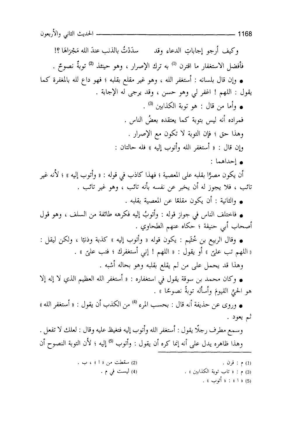 والثانية: أنْ يكون مقلعاً عن المعصية بقلبه، فاختلف الناس في جوازِ قوله: وأتوب إليه، فكرهه طائفةٌ من السَّلف، وهو قولُ أصحاب أبي حنيفة حكاه عنهم الطحاوي، وقال الربيع بن خثيم: يكونُ قولُه: ((وأتوب إليه)) كذبةً وذنباً، ولكن ليقل: اللهمَّ تُبْ عليَّ، أو يقول: اللهمَّ إنِّي أستغفرك فتُب عليَّ، وهذا قد يُحمل على من لم يقلع بقلبه وهو بحاله أشبه. وكان محمد بن سوقة يقول في استغفاره: استغفر الله العظيم الذي لا إله إلا هو الحيّ القيوم وأسأله توبة نصوحاً.