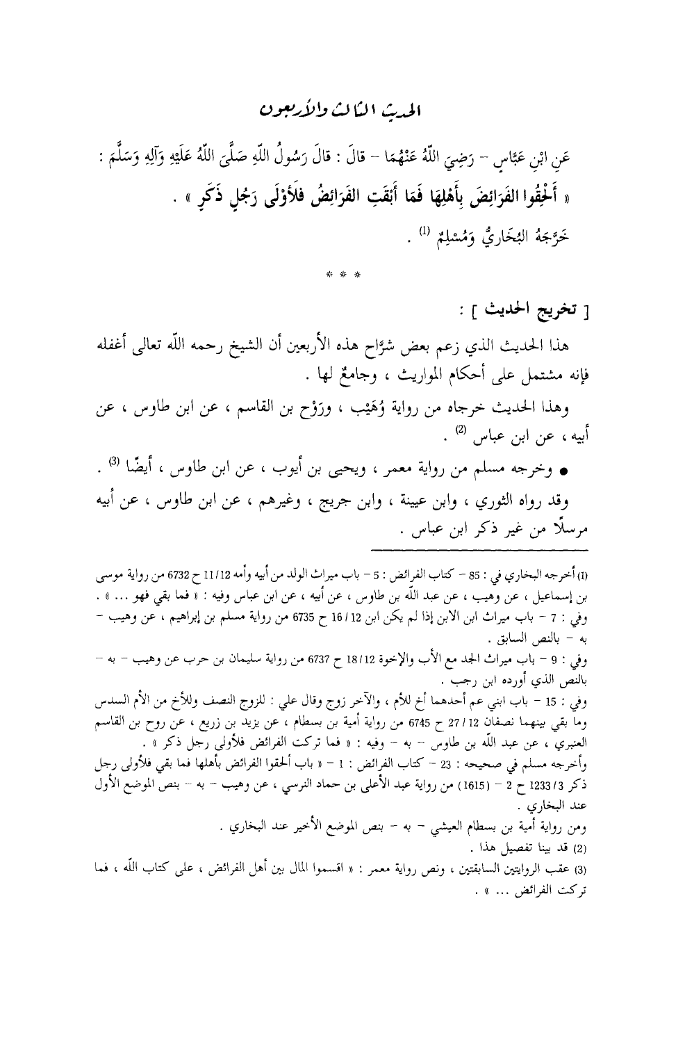 - أغفله، فإنَّه مشتمل على أحكام المواريث وجامع لها، وهذا الحديث خرَّجاه من رواية وهيب، وروح بن القاسم، عن ابن طاووس، عن أبيه، عن ابن عباس، وخرَّجه مسلم (¬3) من رواية معمر، ويحيى بن أيوب، عن ابن طاووس أيضاً. وقد رواه الثوري (¬4) ، وابنُ عيينة، وابن جريج وغيرهُم عن ابن طاووس عن أبيه مرسلاً من غير ذكر ابنِ عباس،