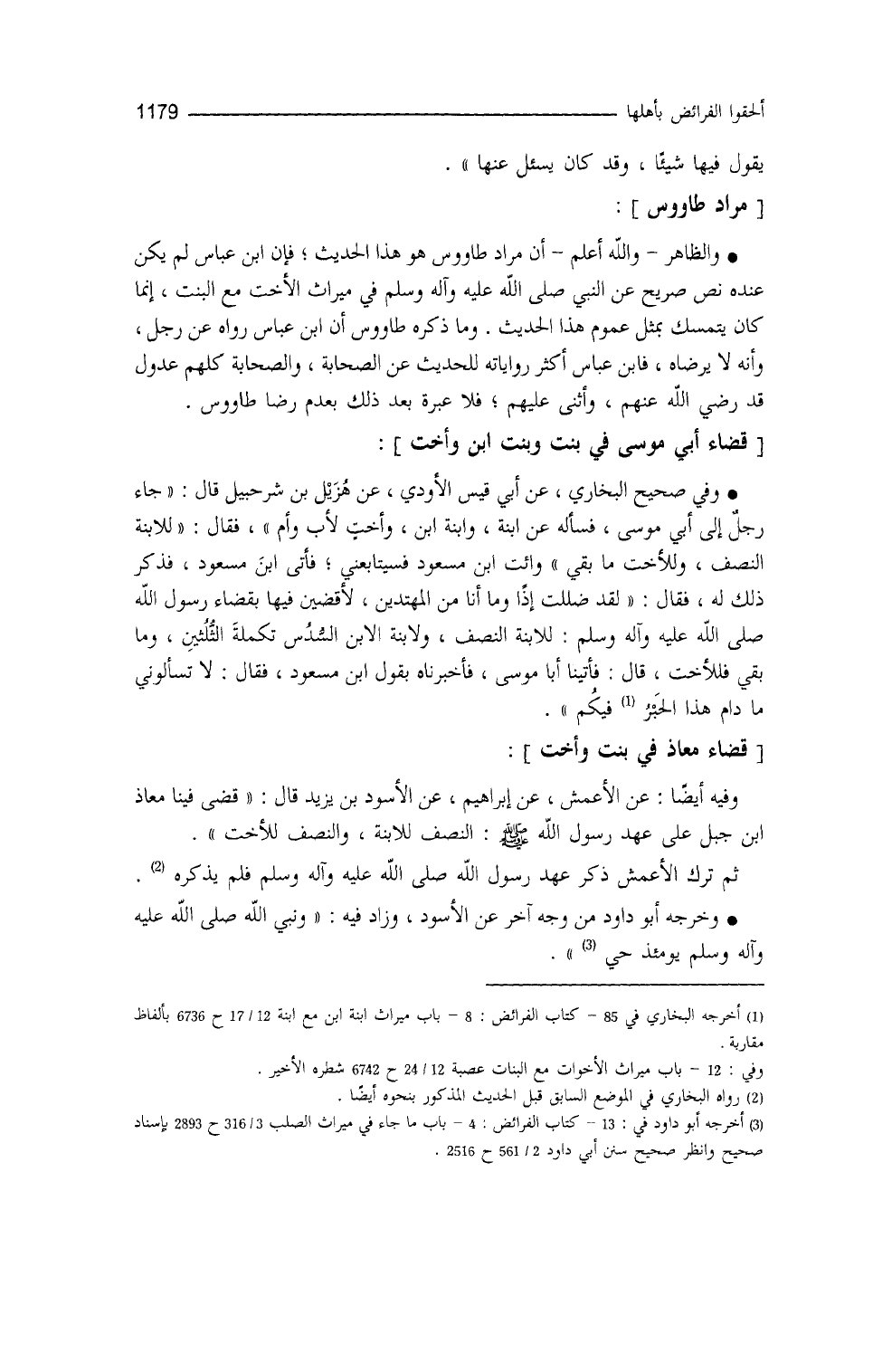 يقول فيها شيئاً، وقد كان يُسأل عنها. والظاهر - والله أعلم - أنَّ مرادَ طاووس هو هذا الحديث، فإنَّ ابنَ عباس لم يكن عنده نصٌّ صريح عن النَّبيِّ - صلى الله عليه وسلم - في ميراثِ الأخت مع البنت، إنَّما كان يتمسك بمثلِ عموم هذا الحديث.