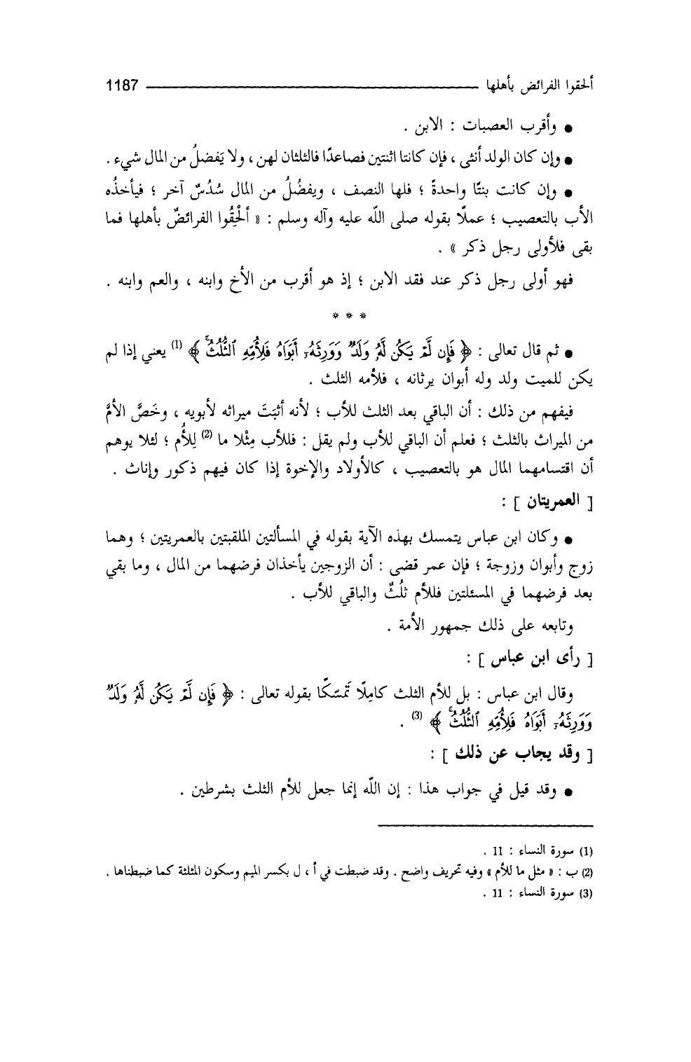 وكان ابنُ عبّاس يتمسَّك بهذه الآية بقوله في المسألتين الملقبتين بالعمريتين وهما: زوجٌ وأبوان، وزوجةٌ وأبوان، فإنَّ عمر قضى أنَّ الزوجين يأخذان فرضَهُما من المال، وما بقي بعد فرضهما في المسألتين، فللأم ثلثُه، والباقي للأب (¬4) ، وتابعه على ذلك جمهور الأمة (¬5) .