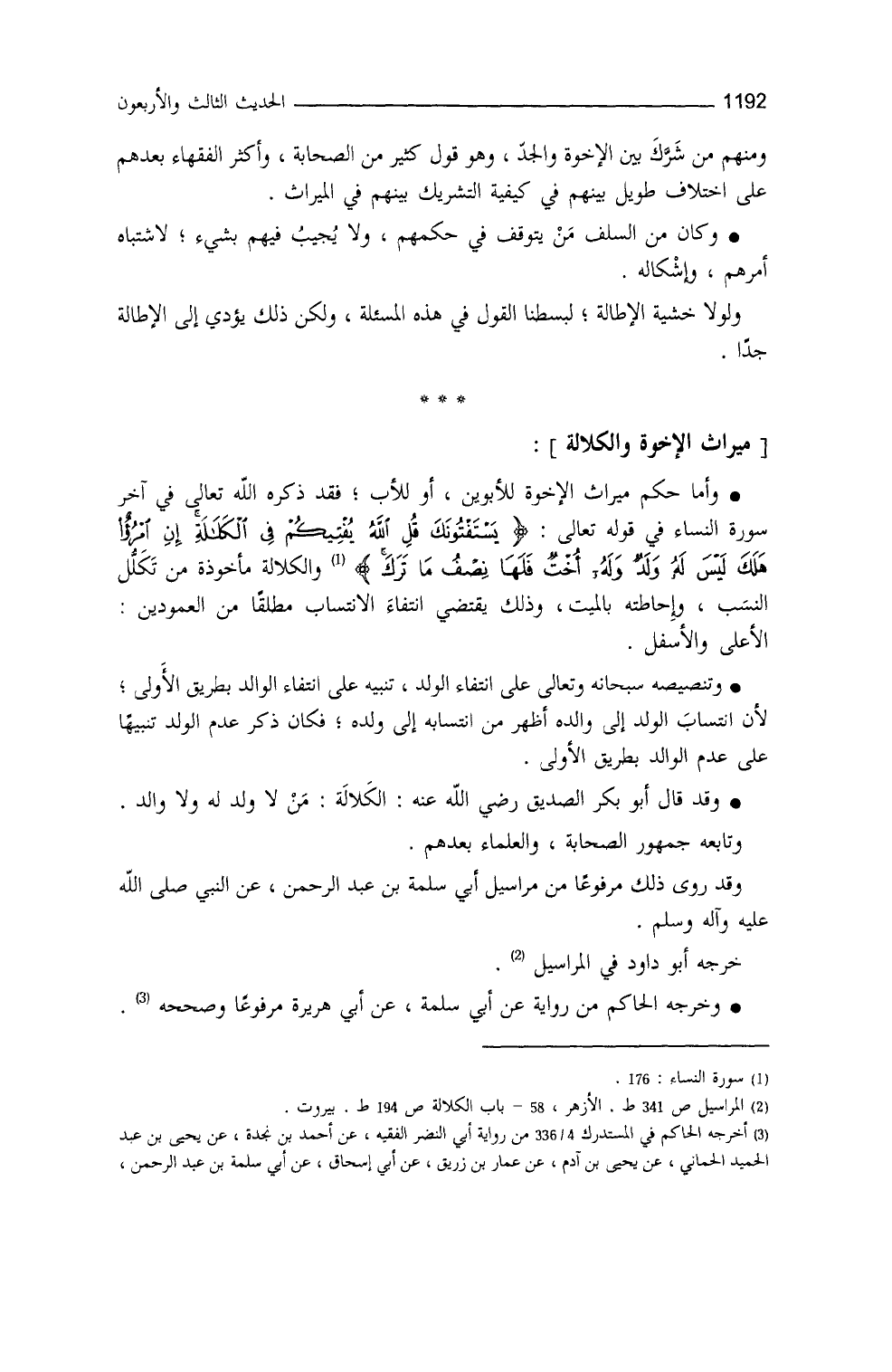 هَلَكَ لَيْسَ لَهُ وَلَدٌ وَلَهُ أُخْتٌ فَلَهَا نِصْفُ مَا تَرَكَ} (¬1) والكَلالةُ مأخوذة من تكلُّلِ النسب وإحاطته بالميت (¬2) ، وذلك يقتضي انتفاءَ الانتساب مطلقاً من العمودين الأعلى والأسفل، وتنصيصُه تعالى على انتفاء الولد تنبيهٌ على انتفاء الوالد بطريق الأولى؛ لأنَّ انتسابَ الولد إلى والده أظهرُ من انتسابه إلى ولده، فكان ذكرُ عدم الولد تنبيهاً على عدم الوالد بطريق الأولى، وقد قال أبو بكر الصديق: الكلالةُ: مَنْ لا وَلَدَ له ولا والد (¬3) ، وتابعه جمهورُ الصحابة والعلماء بعدهم، وقد رُوي ذلك مرفوعاً من مراسيل أبي سلمة بن عبد الرحمان، عن النَّبيِّ - صلى الله عليه وسلم -، خرَّجه أبو داود في " المراسيل " (¬4) ، وخرَّجه الحاكم (¬5) من روايةٍ عن أبي سلمة، عن أبي هريرة مرفوعاً، وصححه،