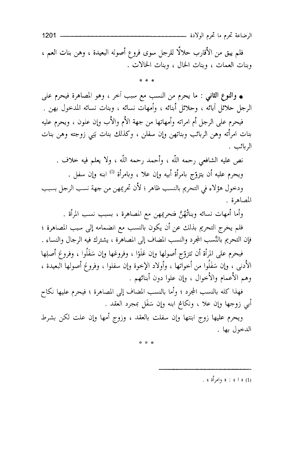 وأما أمهات نسائه وبناتهن، فتحريمهن مع المصاهرة بسبب نسبِ المرأة، فلم يخرجِ التحريمُ بذلك عن أنْ يكونَ بالنَّسبِ مع انضمامه إلى سبب المصاهرة، فإنَّ التحريم بالنَّسب المجرد، والنَّسب المضاف إلى المصاهرة يشترك فيه الرجال والنساءُ؛ فيحرمُ على المرأة أنْ تتزوَّج أصولها وإنْ علَوا، وفروعها وإنْ سفَلُوا، وفروعَ أصلها الأدنى وإنْ سفَلُوا من أخوتها، وأولادِ الإخوة وإنْ سفلوا، وفروعَ أصولها البعيدة وهم الأعمامُ والأخوالُ وإنْ عَلوا دونَ أبنائهم، فهذا كله بالنَّسب المجرَّد (¬4) .