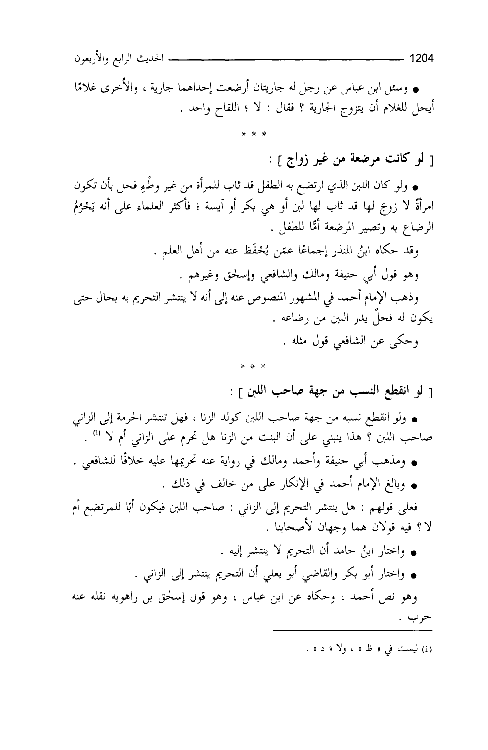 ولو انقطع نسبه من جهة صاحبِ اللبن، كولد الزِّنى، فهل تَنْتَشر الحرمة إلى الزاني صاحب اللبن؟ هذا ينبني على أنَّ البنتَ من الزنى هل تحرم على الزَّاني؟ ومذهبُ أبي حنيفة وأحمد ومالك في رواية عنه تحريمها عليه خلافاً للشافعي، وبالغ الإمام أحمد في الإنكار على من خالف في ذلك، فعلى قولهم: هل ينتشر التَّحريمُ إلى الزاني صاحب اللبن، فيكون أباً للمرتضع أم لا؟ فيه قولان هما وجهان
