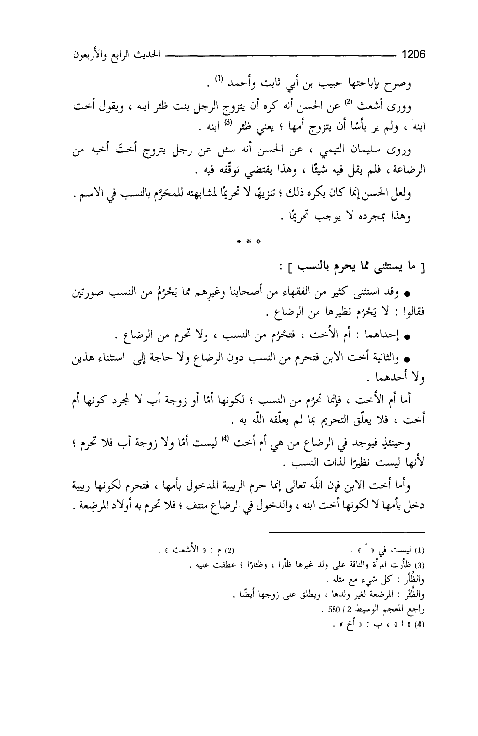 وقد استثنى كثيرٌ من الفقهاء من أصحابنا وغيرهم مما يحرم من النسب صورتين، فقالوا: لا يحرم نظيرُهما مِنَ الرَّضاع: