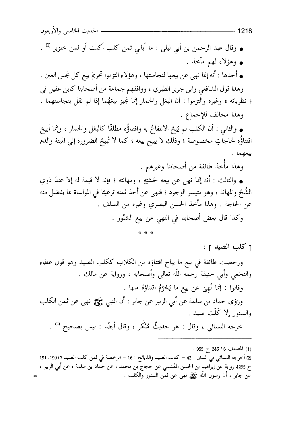 ورخَّصت طائفةٌ في بيع ما يُباح اقتناؤُه مِنَ الكلاب، ككلب الصَّيد، وهو قولُ عطاء والنَّخعي وأبي حنيفة وأصحابه، ورواية عن مالك، وقالوا: إنَّما نهي عن بيع ما يحرُمُ اقتناؤُه منها (¬3) . وروى حماد بن سلمة، عن أبي الزبير، عن جابر أنَّ النَّبيَّ - صلى الله عليه وسلم - نهى عن ثمن الكلب والسنور، إلا كلب صيد، خرَّجه النَّسائي (¬4) ، وقال: هو حديثٌ منكر، وقال أيضاً: ليس بصحيح،