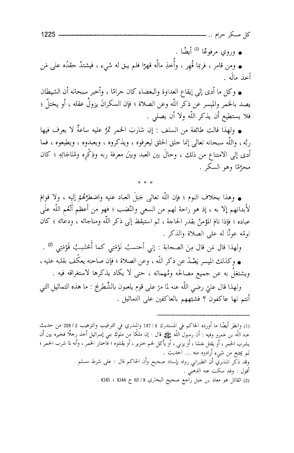 ومن قامر، فربما قُهرَ، وأُخذ ماله منه قهراً، فلم يبق له شيء، فيشتدُّ حِقدُه على من أخذ ماله. وكلُّ ما أدى إلى إيقاع العداوة والبغضاء كان حراماً، وأخبر سبحانه أنَّ الشيطان يصدُّ بالخمر والميسر عن ذكر الله وعنِ الصَّلاةِ، فإنَّ السَّكران يزولُ عقلُه، أو يختلُّ، فلا يستطيعُ أنْ يذكرَ الله، ولا أنْ يُصلِّي، ولهذا قال طائفة مِنَ السَّلف (¬2) : إنَّ شاربَ الخمر تمرُّ عليه ساعة لا يعرف فيها ربَّه، والله سبحانه إنَّما خلق الخلق ليعرفوه، ويذكروه، ويعبدوه، ويُطيعوه (¬3) ، فما أدَّى إلى الامتناعِ من ذلك، وحال بين العبد وبين معرفة ربه وذكره ومناجاته، كان محرَّماً، وهو السكر، وهذا بخلاف النَّوم، فإنَّ الله تعالى جَبَل العباد عليه، واضطرهم إليه، ولا قِوام لأبدانهم إلا به، إذ هو راحة لهم من السعي والنصب، فهو من أعظم نِعَمِ الله على عباده، فإذا نام المؤمن بقدر الحاجة، ثم استيقظ إلى ذكر الله ومناجاته ودعائه، كان نومُه عوناً له على الصلاة والذكر، ولهذا قال من قال من الصحابة: إني أحتسب نومتي كما أحتسب قومتي.