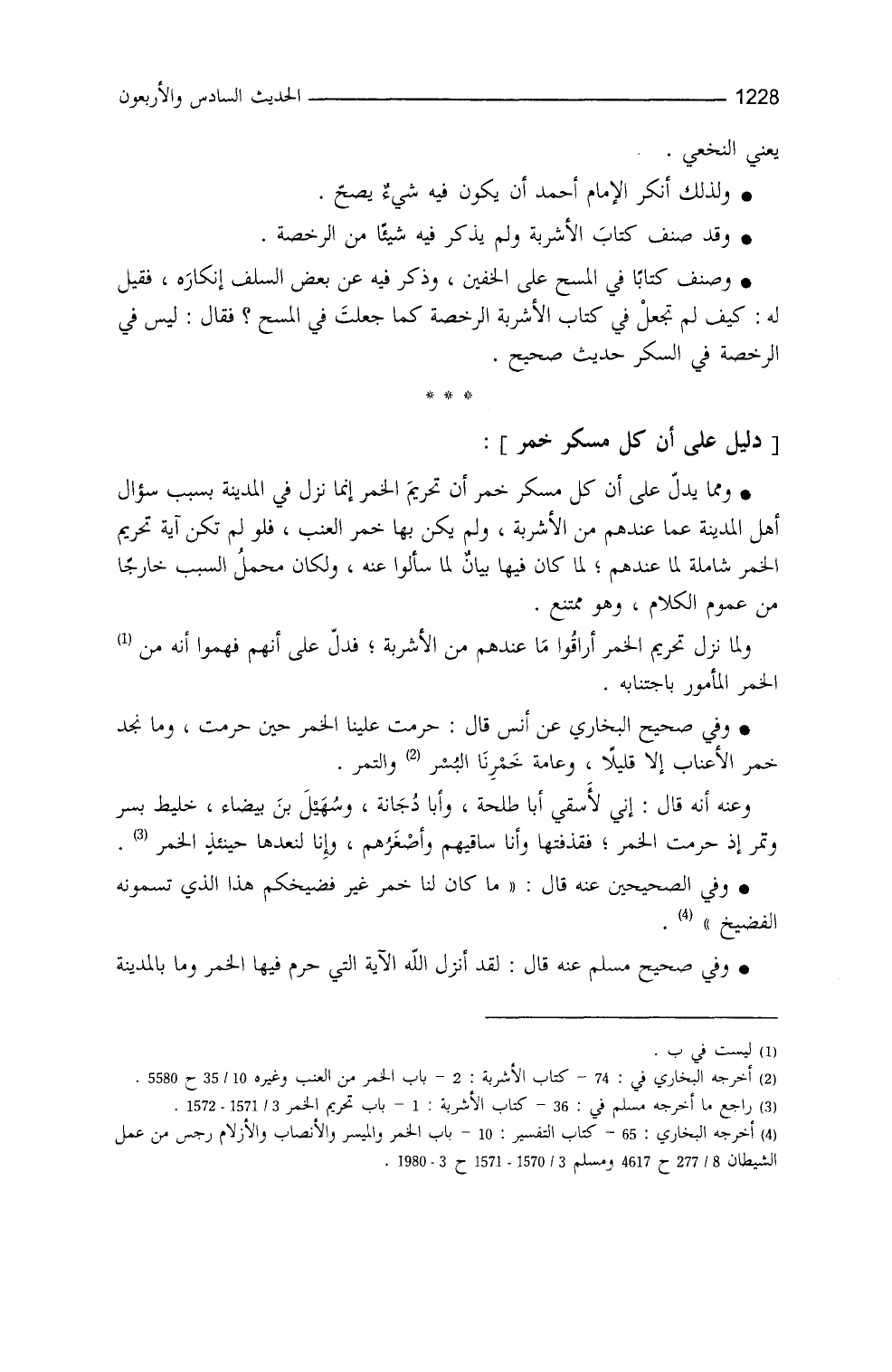 يعني: النَّخعي (¬1) -، وكذلك أنكر الإمامُ أحمد أنْ يكونَ فيه شيءٌ يصحُّ، وقد صنف كتاب " الأشربة " ولم يذكر فيه شيئاً من الرخصة، وصنَّف كتاباً في المسح على الخفين، وذكر فيه عن بعض السَّلف إنكاره، فقيل له: كيف لم تجعل في كتاب " الأشربة " الرخصة كما