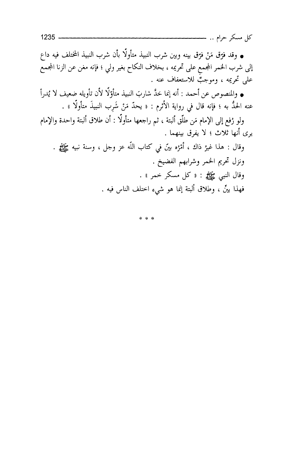 تحريمه بخلاف الناكح بغير وليٍّ، فإنَّه مغنٍ عن الزنى المجمع على تحريمه، وموجب للاستعفاف عنه. والمنصوصُ عن أحمد أنَّه إنَّما حدَّ شارب النبيذ متأوِّلاً؛ لأنَّ تأويلَه ضعيف لا يُدرأُ عنه الحدُّ به، فإنَّه قال في رواية الأثرم: يُحدُّ من شرب النبيذ متأوِّلاً، ولو رُفِعَ إلى الإمام من طَلَّق البتة، ثم راجعها متأوِّلاً أنَّ طلاق البتة
