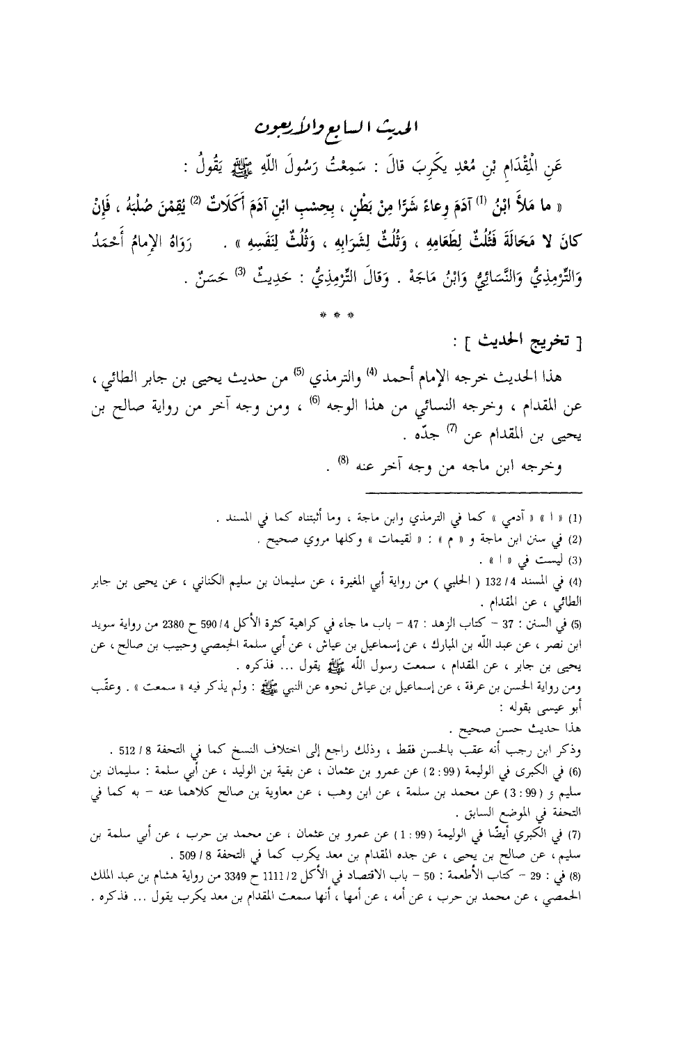 عَنِ المِقدامِ بنِ مَعدِ يكرِبَ قالَ: سَمِعْتُ رَسولَ اللهِ - صلى الله عليه وسلم - يَقولُ: ((ما مَلأ آدميٌّ وِعاءً شَرّاً مِنْ بَطْنٍ، بِحَسْبِ ابنِ آدمَ أَكَلاتٌ يُقِمْنَ صُلْبَهُ، فإنْ كَانَ لا مَحالَةَ، فَثُلُثٌ لِطعامِهِ، وثُلُثٌ لِشَرابِهِ، وثُلُثٌ لِنَفسه)) رواهُ الإمامُ أحمَدُ والتِّرمِذيُّ والنَّسائيُّ وابنُ ماجَهْ، وقَالَ التِّرمِذيُّ: حَدِيثٌ حَسَنٌ.