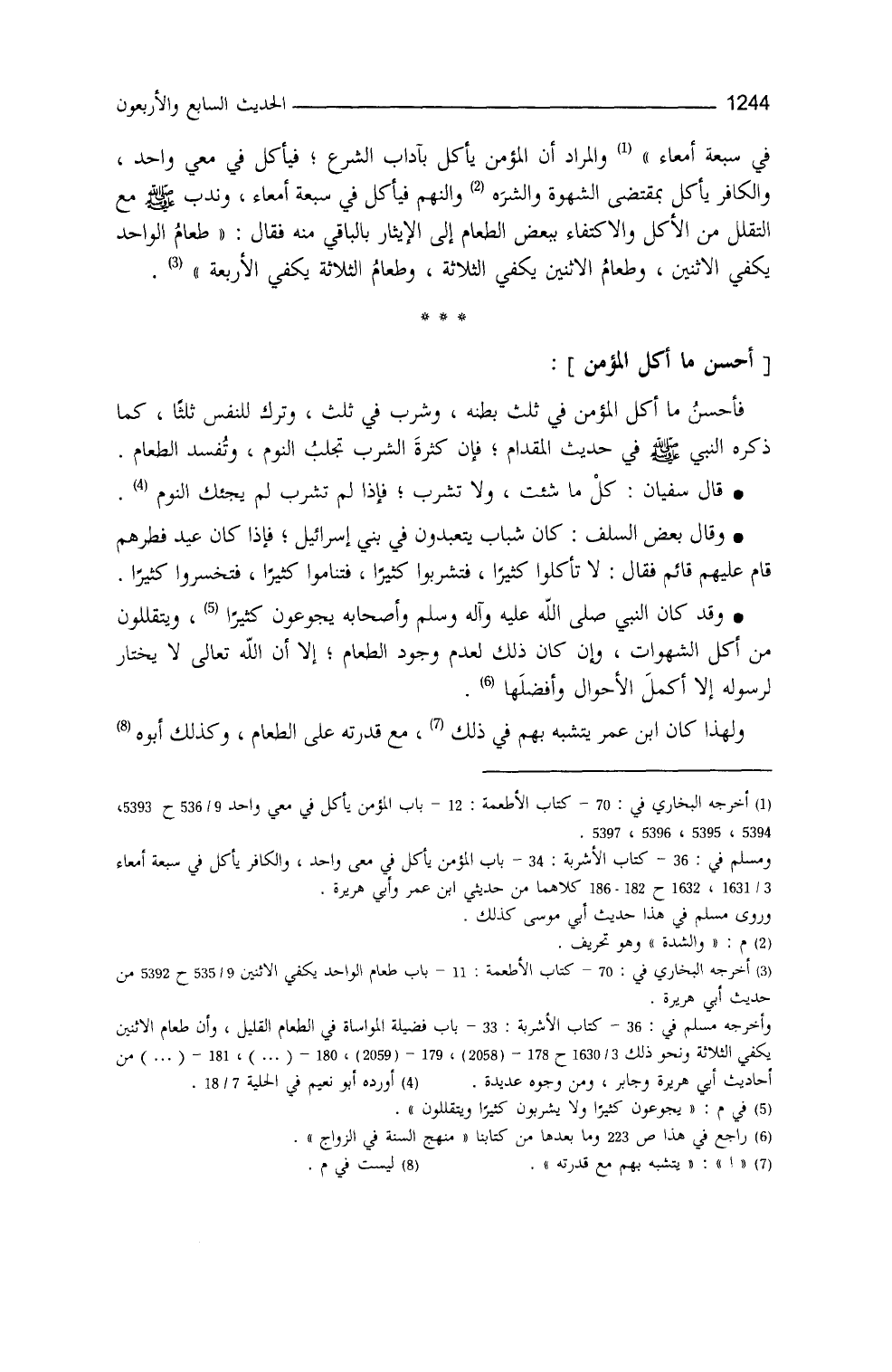 في سبعة أمعاء)) والمراد أنَّ المؤمن يأكلُ بأدبِ الشَّرع، فيأكل في مِعًى واحدٍ، والكافر يأكل بمقتضى الشَّهوة والشَّرَهِ والنَّهم، فيأكلُ في سبعة أمعاء.