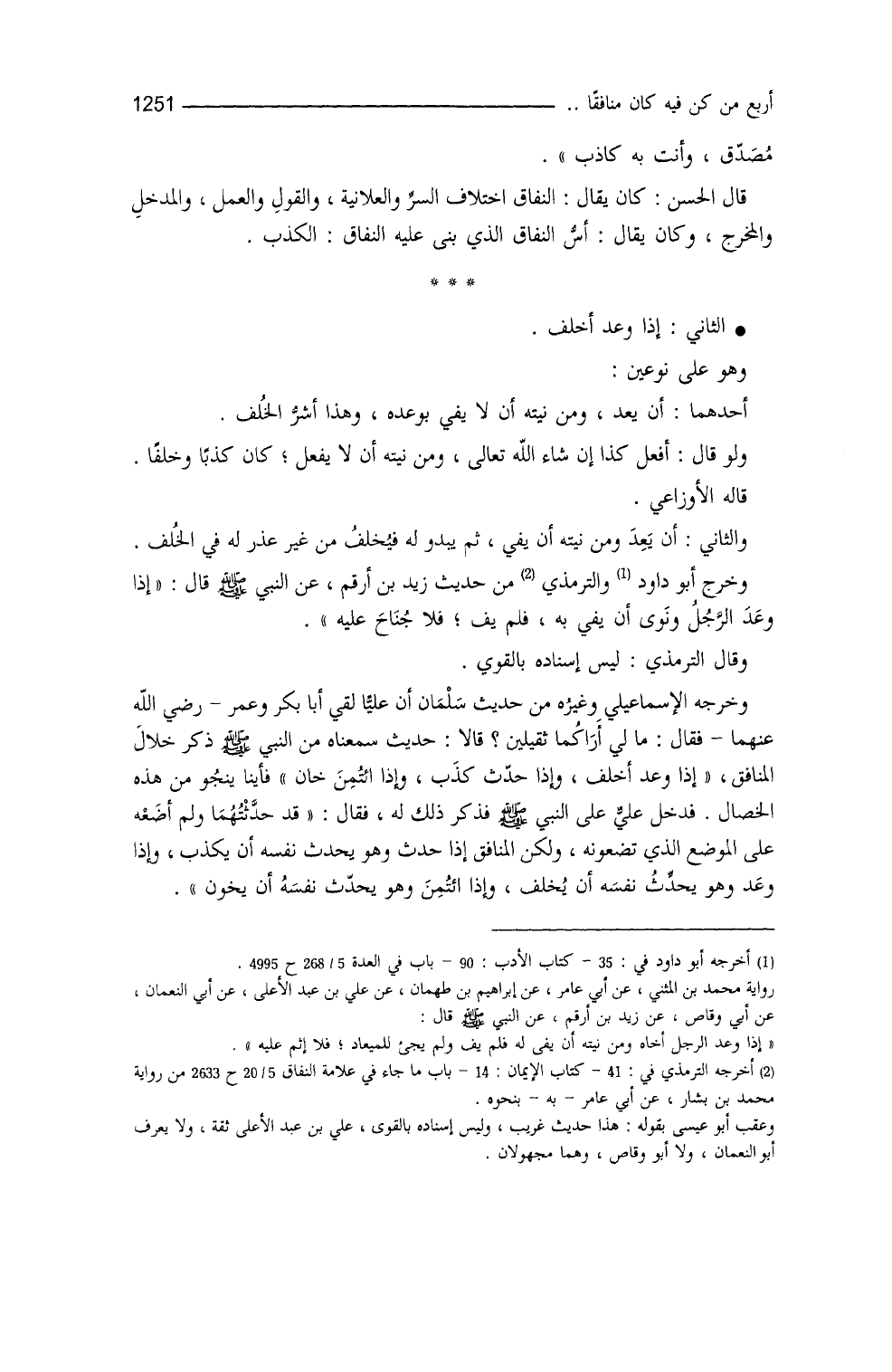 من حديث زيد بنِ أرقم، عن النَّبيِّ - صلى الله عليه وسلم -، قال: ((إذا وعَد الرَّجُلُ ونَوى أنْ يفي به، فلم يَفِ، فلا جُناحَ عليه)) . وقال الترمذي (¬4) : ليس إسنادُه بالقوي.