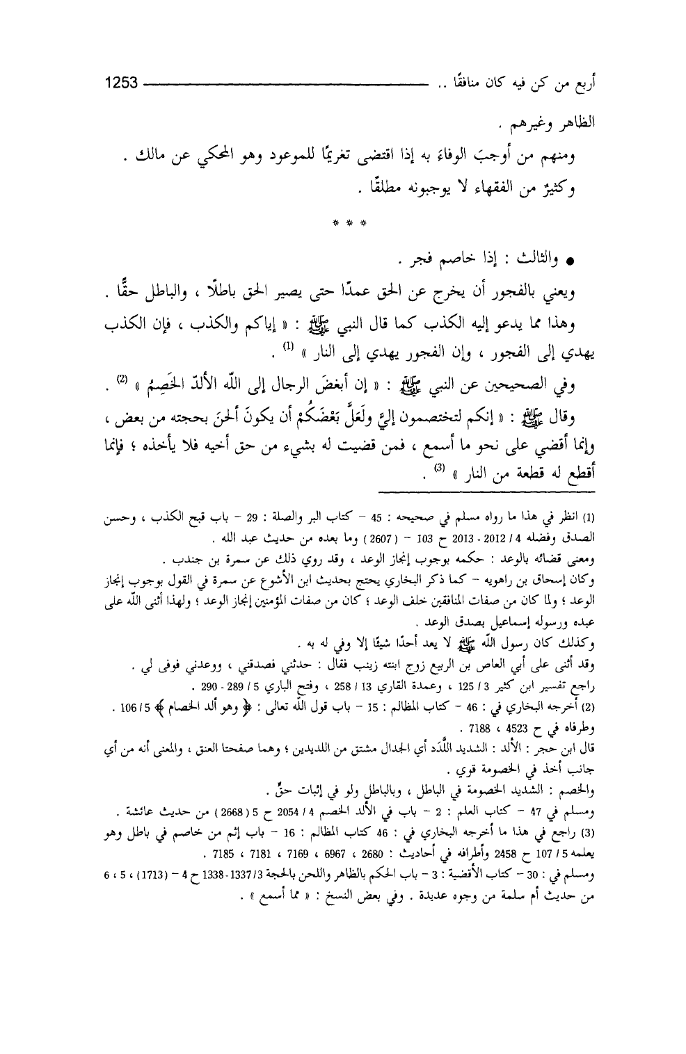 والثالث: إذا خاصم فجر ويعني بالفجور أنْ يخرج عن الحقِّ عمداً حتى يصير الحقُّ باطلاً والباطلُ حقاً، وهذا مما يدعو إليه الكذبُ (¬1) ، كما قال - صلى الله عليه وسلم -: ((إيَّاكم والكَذِبَ، فإنَّ الكذِبَ يهدي إلى الفُجور، وإنَّ الفجور يهدي إلى النارِ)) (¬2) .