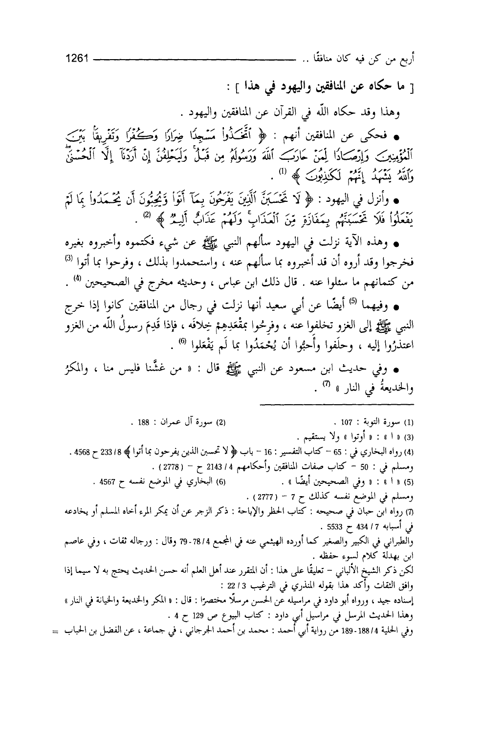 وهذا قد حكاه الله في القرآن عن المنافقين واليهود، فحكى عن المنافقين أنَّهم: {اتَّخَذُوا مَسْجِداً ضِرَاراً وَكُفْراً وَتَفْرِيقاً بَيْنَ الْمُؤْمِنِينَ وَإِرْصَادَاً لِمَنْ حَارَبَ اللهَ وَرَسُولَهُ مِنْ قَبْلُ وَلَيَحْلِفُنَّ إِنْ أَرَدْنَا إِلاّ الْحُسْنَى وَاللهُ يَشْهَدُ إِنَّهُمْ لَكَاذِبُونَ} (¬1) ، وأنزل في اليهود: {لا تَحْسَبَنَّ الَّذِينَ يَفْرَحُونَ بِمَا أَتَوْا وَيُحِبُّونَ أَنْ يُحْمَدُوا بِمَا لَمْ يَفْعَلُوا فَلا تَحْسَبَنَّهُمْ بِمَفَازَةٍ مِنَ الْعَذَابِ وَلَهُمْ عَذَابٌ أَلِيمٌ} (¬2) وهذه الآية نزلت في اليهود، سألهم النَّبيُّ - صلى الله عليه وسلم - عن شيءٍ فكتموه، وأخبروه بغيره، فخرجوا وقد أروه أنَّهم قد أخبروه بما سألهم عنه، واستحمدوا بذلك، وفرِحُوا بما أُوتوا من كتمانهم وما سُئِلوا عنه، قال ذلك ابن عباس، وحديثُه مخرج في " الصحيحين " (¬3) .