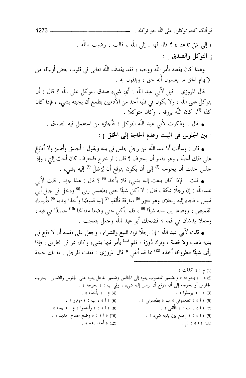 لها: إلى الله، قالت: رضيتُ بالله، وهذا كان يفعله بأمر الله ووحيه، فقد يَقذِفُ الله في قلوب بعض أوليائه من الإلهام الحقِّ ما يعلمون أنَّه حقٌّ، ويثقون به. قال المروذي: قيل لأبي عبد الله: أيّ شيءٍ صِدقُ التوكل على الله؟ قال: أنْ يتوكَّل على الله، ولا يكون في قلبه أحدٌ من الآدميين يطمع أنْ يجيئه بشيءٍ، فإذا كان كذا، كان الله يرزقه، وكان متوكِّلاً (¬1) .