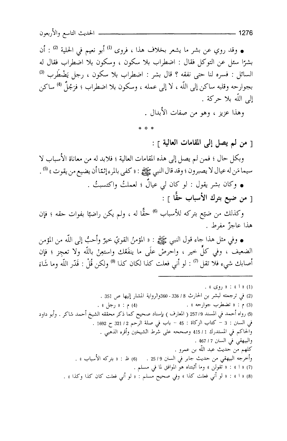 وبكل حال، فمن لم يصل إلى هذه المقامات العالية، فلابُدَّ له من معاناة الأسباب لاسيما من له عيال لا يصبرون، وقد قال النَّبيُّ - صلى الله عليه وسلم -: ((كَفى بالمرءِ إثماً أنْ يُضيِّعَ من يَقُوتُ)) (¬2) . وكان بشرٌ يقول: لو كان لي عيالٌ لعملتُ واكتسبتُ.