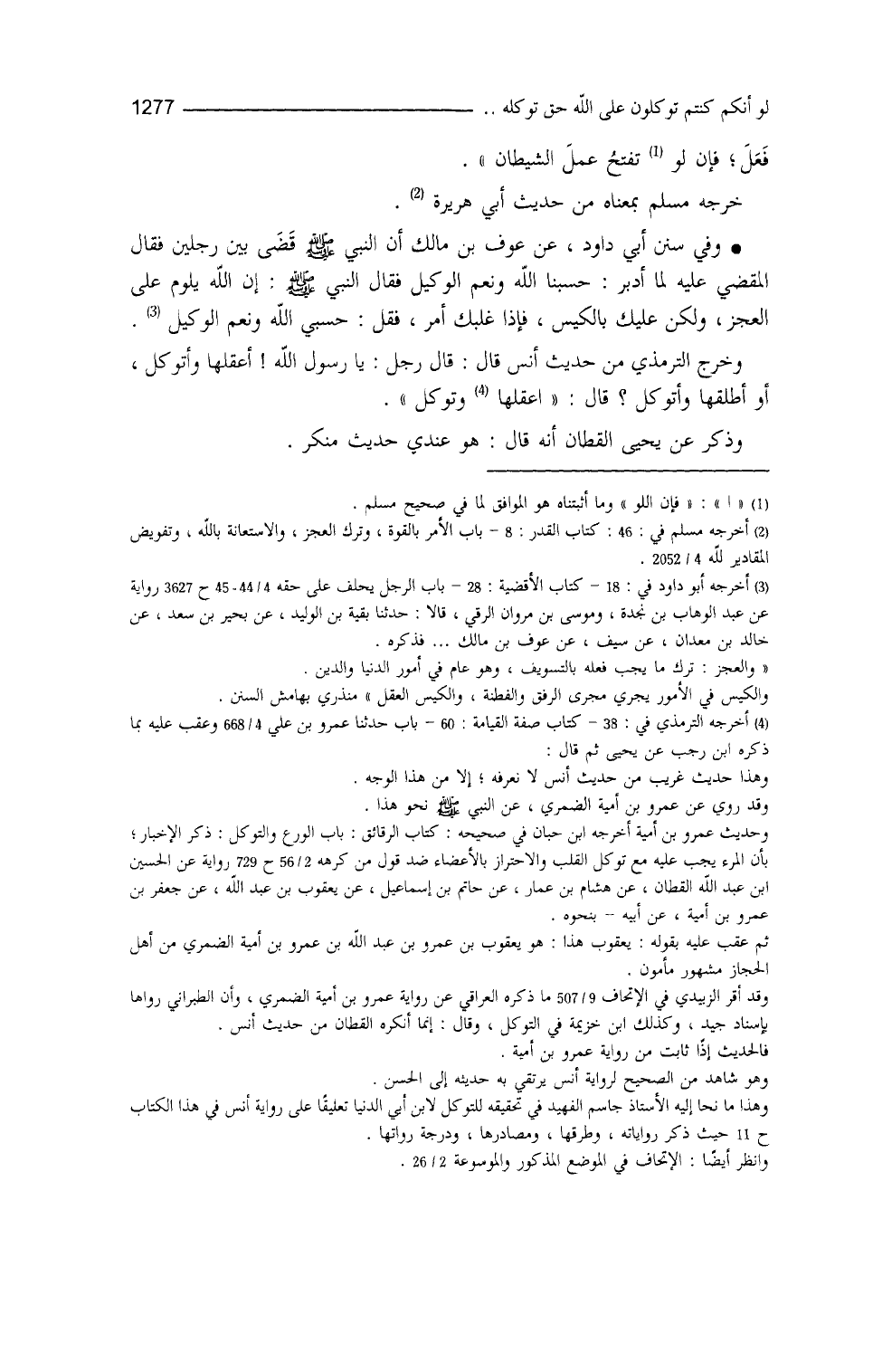 وخرَّج الترمذي (¬3) من حديث أنس، قال: قال رجل: يا رسول الله، أعقلها وأتوكَّل، أو أُطلقها وأتوكَّل؟ قال: ((اعقلها وتوكَّل)) . وذكر عن يحيى القطان أنَّه قال: هو عندي حديث منكر (¬4) ،