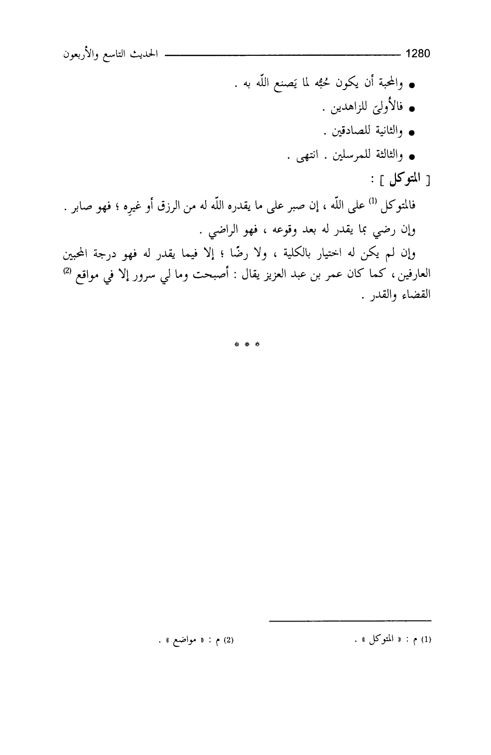 فالمتوكل على الله إنْ صبر على ما يُقدِّرُه الله له من الرزق أو غيره، فهو صابر، وإنْ رضي بما يُقدر له بعد وقوعه، فهو الراضي، وإنْ لم يكن له اختيارٌ بالكليَّة ولا رضا إلا فيما يقدر له، فهو درجة المحبين العارفين، كما كان عمر بنُ عبد العزيز يقول: أصبحتُ وما لي سرور إلا في مواضع القضاء والقدر.