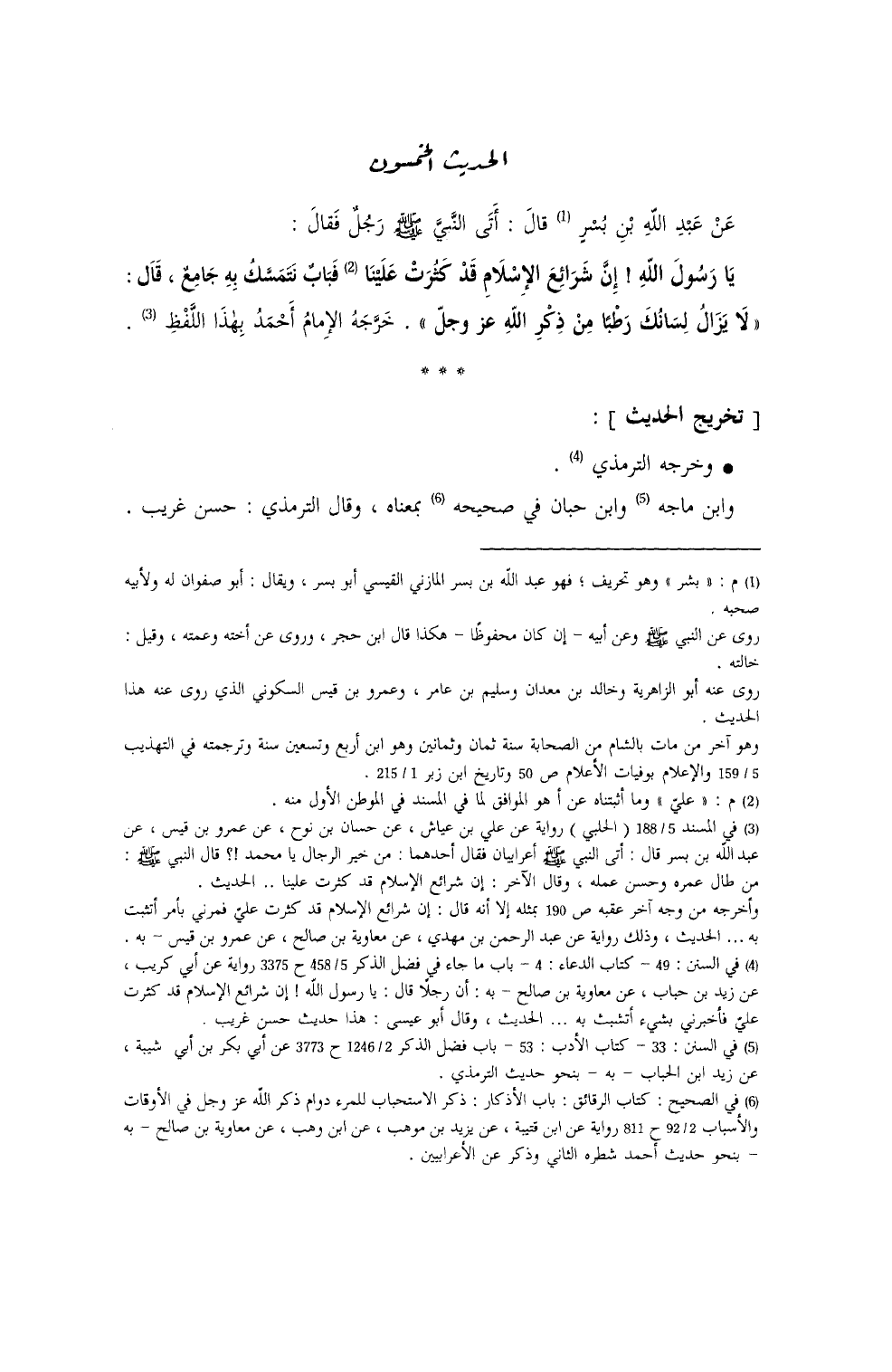 عَنْ عبدِ الله بن بُسْرٍ قال: أتى النَّبيَّ - صلى الله عليه وسلم - رَجلٌ، فقالَ: يا رَسولَ اللهِ إنَّ شرائعَ الإسلامِ قد كَثُرَتْ علينا، فبَابٌ نَتَمسَّكُ به جامعٌ؟ قال: ((لا يَزالُ لِسانُكَ رَطْباً مِنْ ذِكر الله - عز وجل -)) خرَّجه الإمامُ أحمدُ (¬1) بهذا اللَّفظِ.