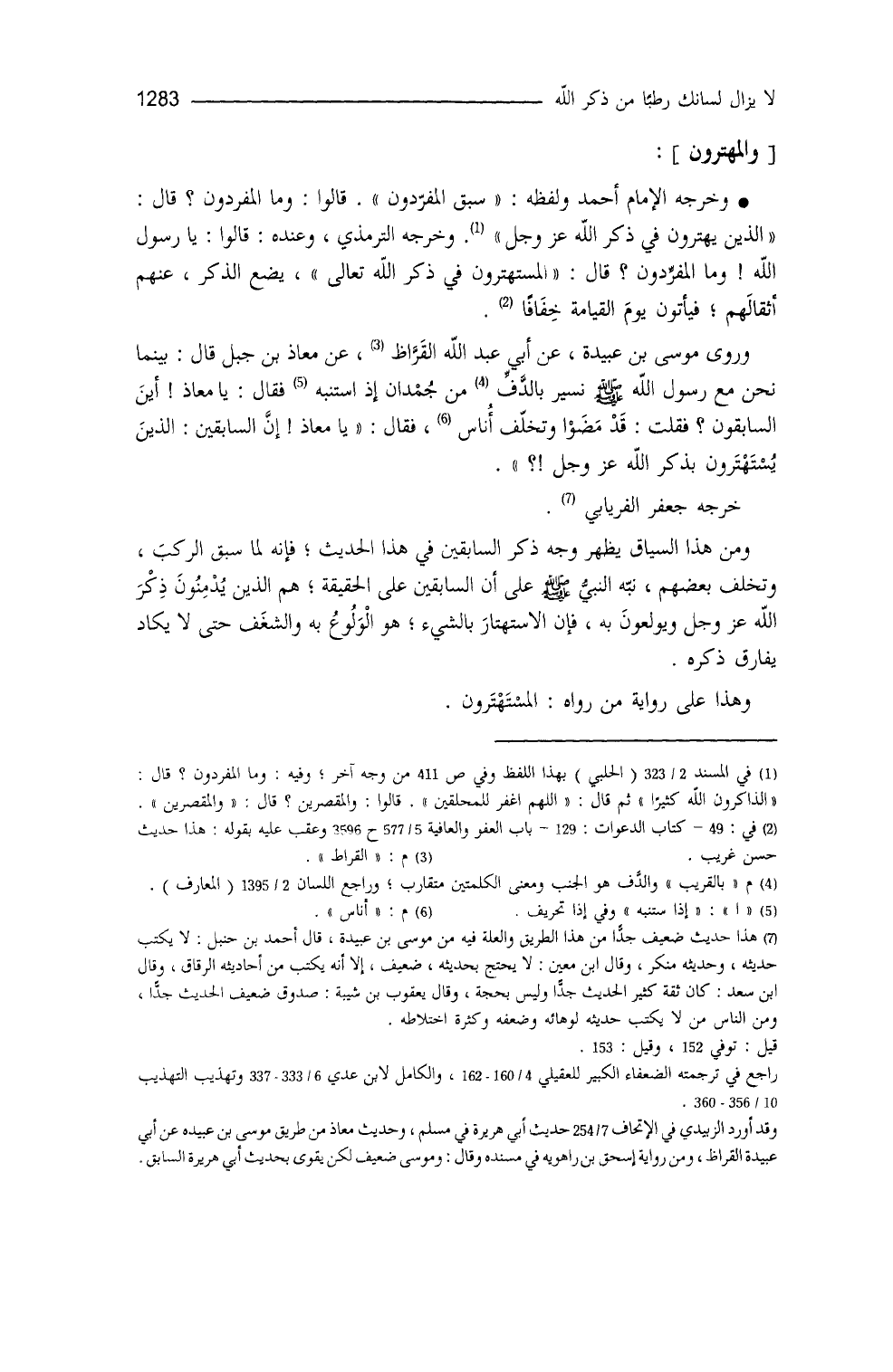 وخرَّجه الإمام أحمد (¬1) ، ولفظه: ((سبقَ المفَرِّدونَ)) قالوا: وما المفردون؟ قال: ((الذينَ يُهْتَرونَ (¬2) في ذكرِ اللهِ)) .