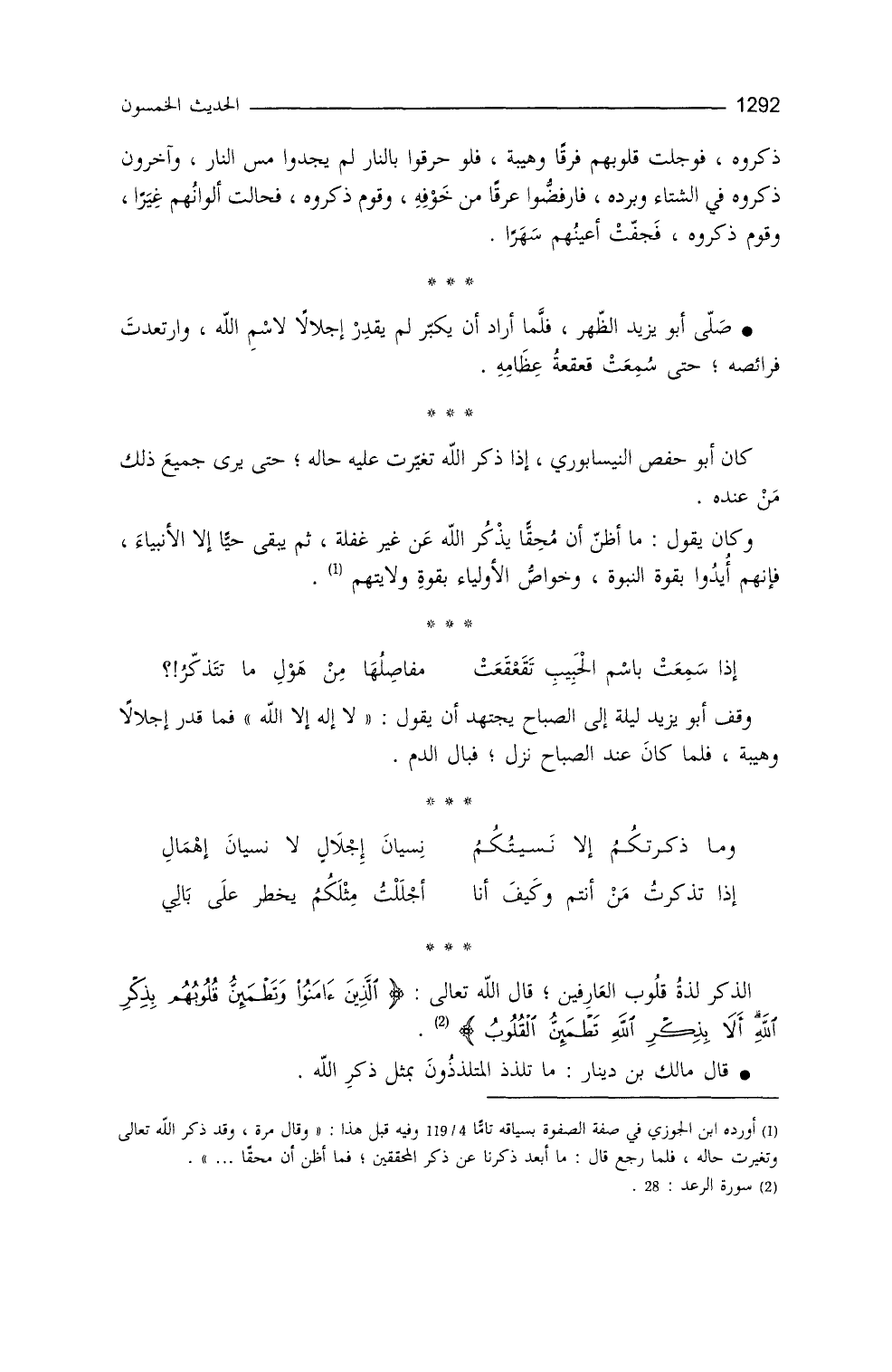 كان أبو حفص النَّيْسابوري إذا ذكر الله تغيَّرت عليه حالُه حتى يرى ذلك جميع من عنده، وكان يقولُ: ما أظن محقاً يذكر الله عن غير غفلة، ثم يبقى حياً إلا الأنبياء، فإنَّهم أيدوا بقوَّة النبوَّة وخواصِّ الأولياء بقوَّة ولايتهم (¬2) .