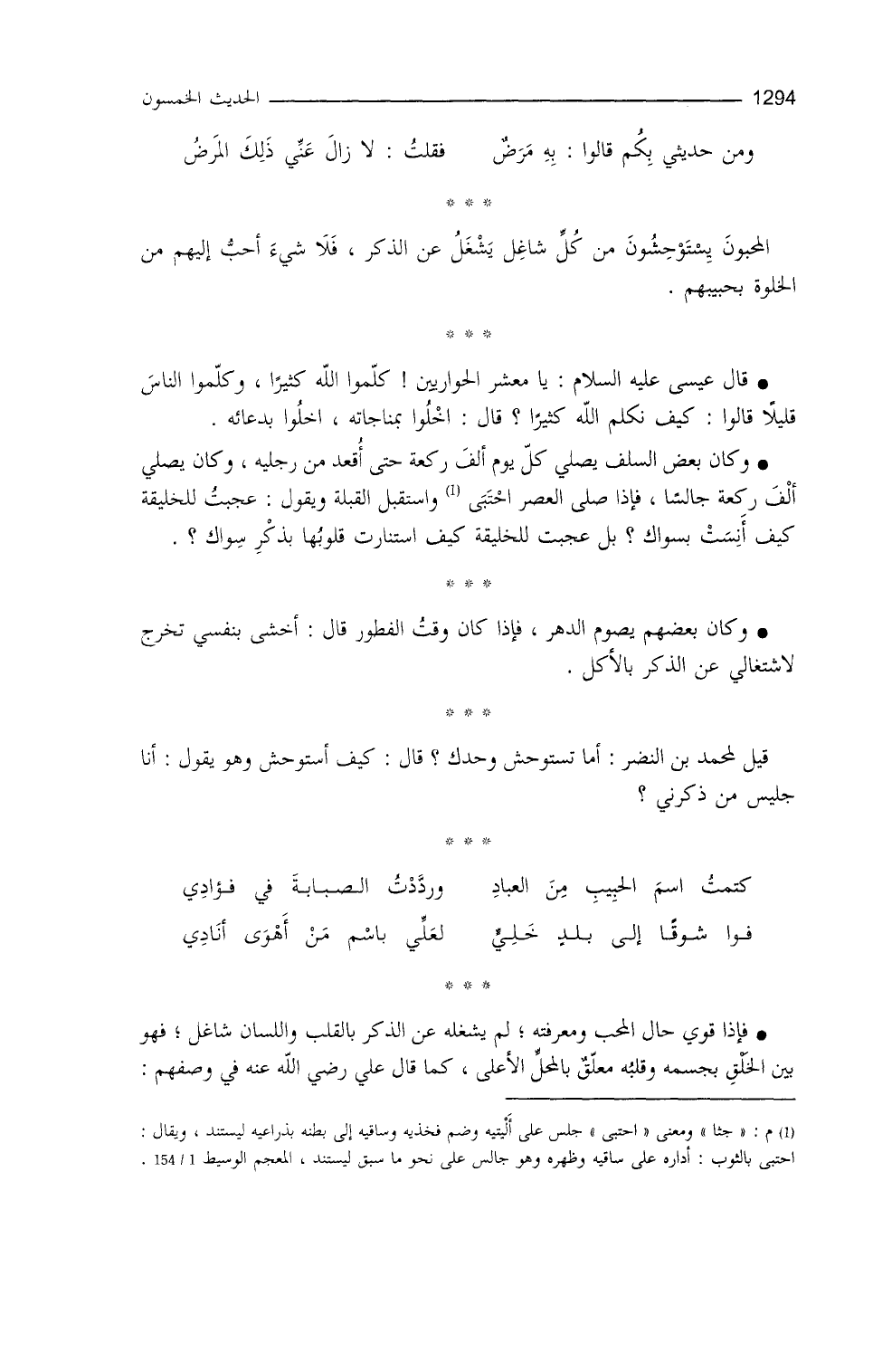 المحبون يستوحشون من كلِّ شاغلٍ يَشغَلُ عن الذكر، فلا شيءَ أحبَّ إليهم من الخلوة بحبيبهم.