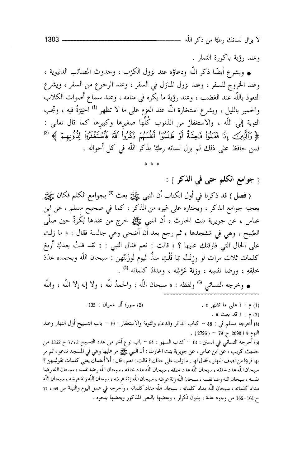 قد ذكرنا في أوَّل الكتاب أنَّ النَّبيَّ - صلى الله عليه وسلم - بُعِثَ بجوامع الكلم، فكان - صلى الله عليه وسلم - يُعجِبُه جوامع الذكر، ويختاره على غيره من الذكر، كما في " صحيح مسلم " (¬9) عن ابن عباس، عن جُويرية بنت الحارث أنَّ النَّبيَّ - صلى الله عليه وسلم - خرج من عندها بُكرةً حين صلَّى الصبحَ وهي في مسجدها، ثمَّ رجع بعد أنْ أضحى وهي جالسةٌ، فقال: ((مازلتِ على الحال التي فارقتك عليها؟)) قالت: نعم، فقال النَّبيُّ - صلى الله عليه وسلم -: ((لقد قلتُ بعدَك أربعَ كلماتٍ ثلاثَ مرات، لو وُزِنَت بما قلتِ منذ اليوم لوزَنتهُنَّ: سبحان الله وبحمده عدد خلقه، ورضا نفسه، وزِنَةَ عرشه، ومداد كلماته)) .