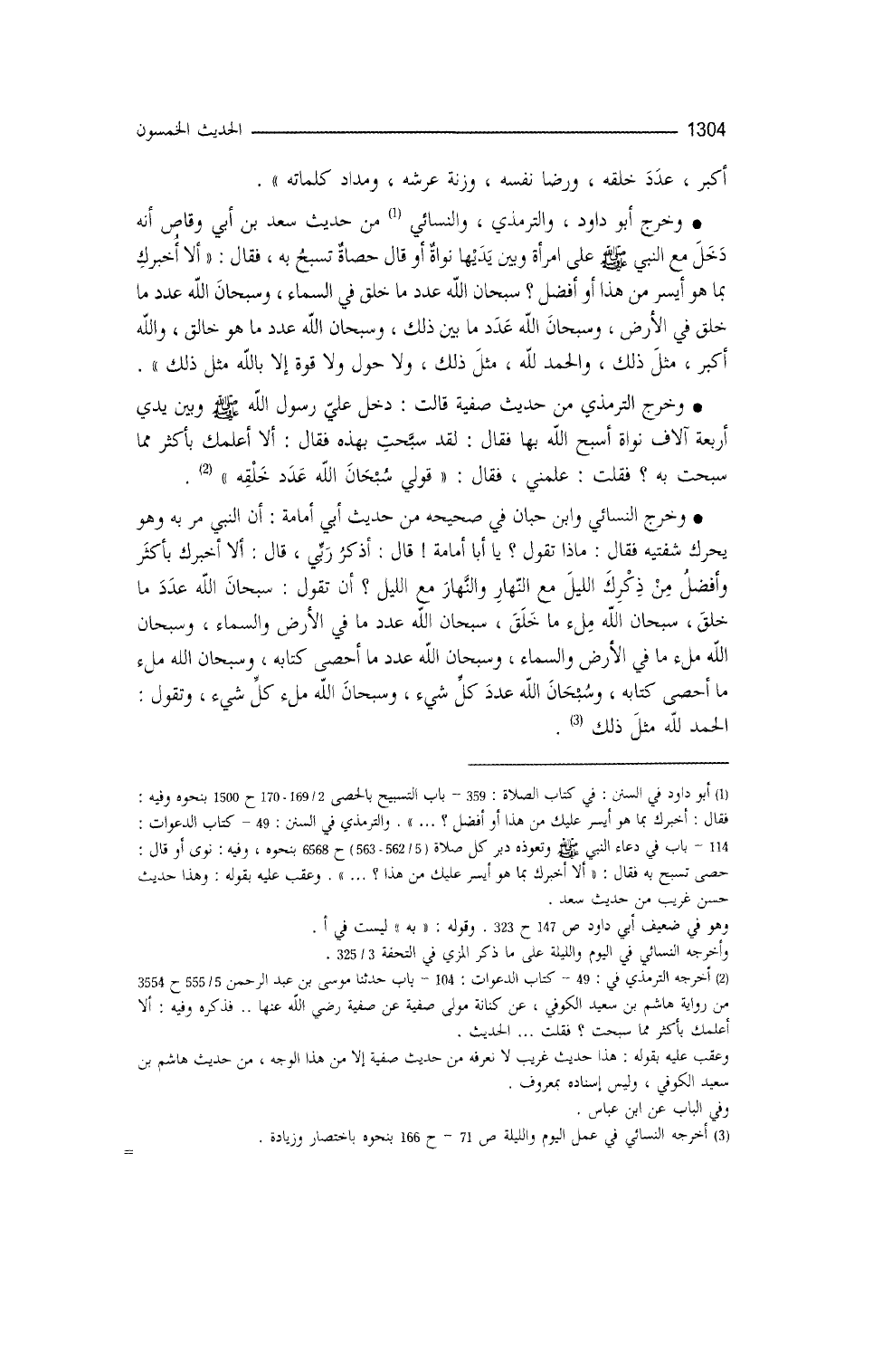 وخرّج أبو داود، والترمذي، والنسائي (¬1) من حديث سعد بن أبي وقّاص أنَّه دخل مع النَّبيِّ - صلى الله عليه وسلم - على امرأةٍ وبَين يديها نوى، أو قال: حَصى تسبِّح به، فقال: ((ألا أُخبِرُك بما هو أيسرُ من هذا وأفضل؟ سبحانَ الله عددَ ما خلق في السماء، وسبحانَ الله عدد ما خلَق في الأرض، وسُبحان الله عدد ما بينَ ذلك، وسبحانَ الله عددَ ما هو خالق، والله أكبر مثلُ ذلك، والحمد لله مثلُ ذلك، ولا حولَ ولا قوةَ إلا بالله مثل ذلك)) .