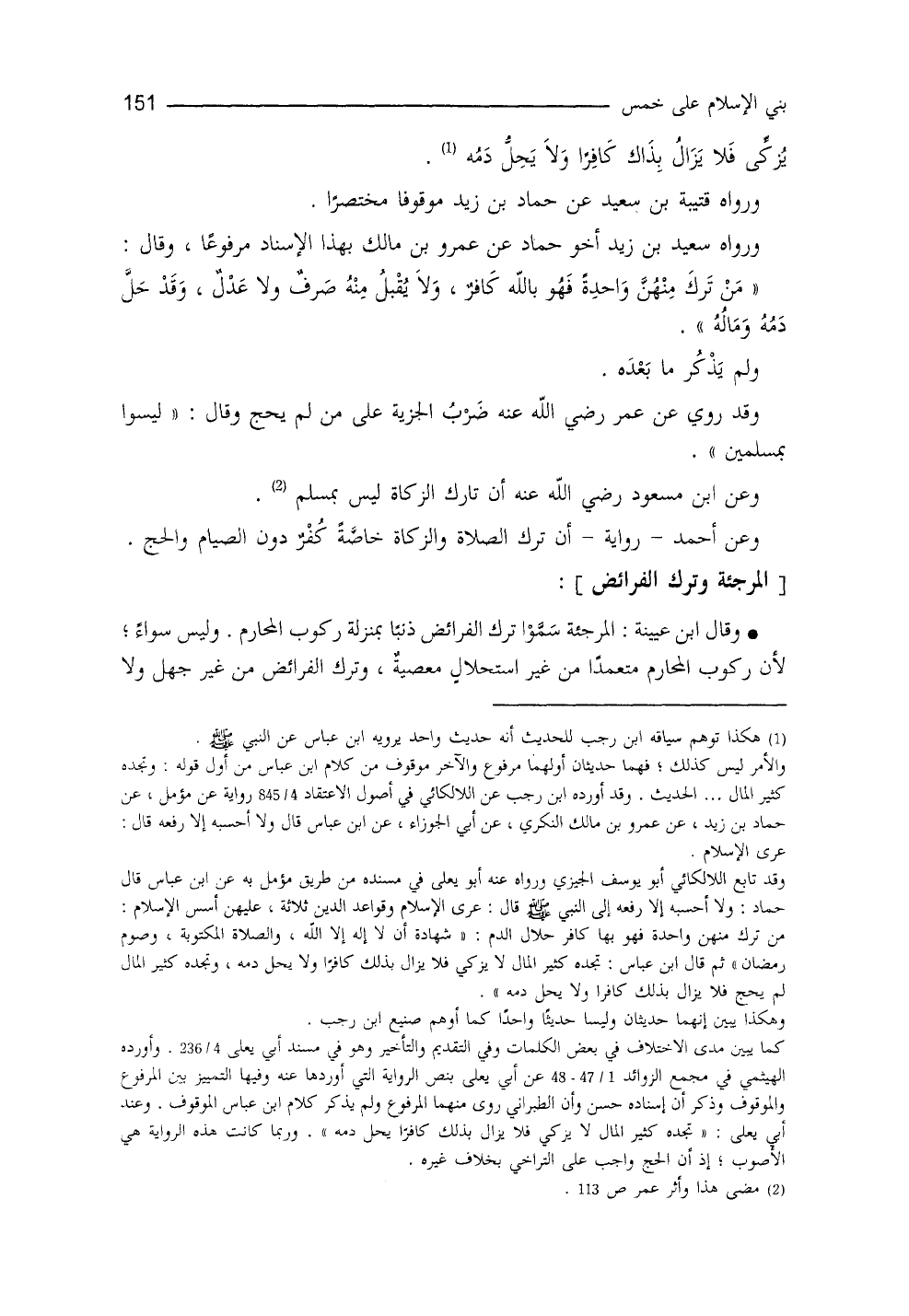 يزكِّي، فلا يزالُ بذلك كافراً ولا يحلُّ دَمُهُ)) ورواه قتيبة بنُ سعيدٍ، عن حماد بنِ زيد موقوفاً مختصراً، ورواه سعيدُ بنُ زيد أخو حماد، عن عمرو بنِ مالك، بهذا الإسناد مرفوعاً، وقال: ((من ترك منهنَّ واحدةً، فهو باللهِ كافرٌ، ولا يُقبَلُ منه صرفٌ ولا عدلٌ، وقد حلَّ دمُه ومالُه)) ولم يذكر