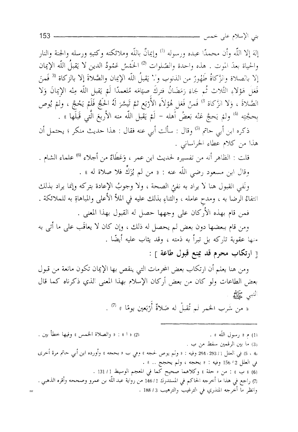 ومن هنا يُعلَمُ أنَّ ارتكابَ بعضِ المحرماتِ التي ينقص بها الإيمانُ تكونُ مانعةً من قبول بعض الطاعات، ولو كان من بعض أركان الإسلام بهذا المعنى الذي ذكرناه، كما قال النَّبيُّ - صلى الله عليه وسلم -: ((مَنْ شرِبَ الخمرَ لم يقبل الله له صلاة أربعين