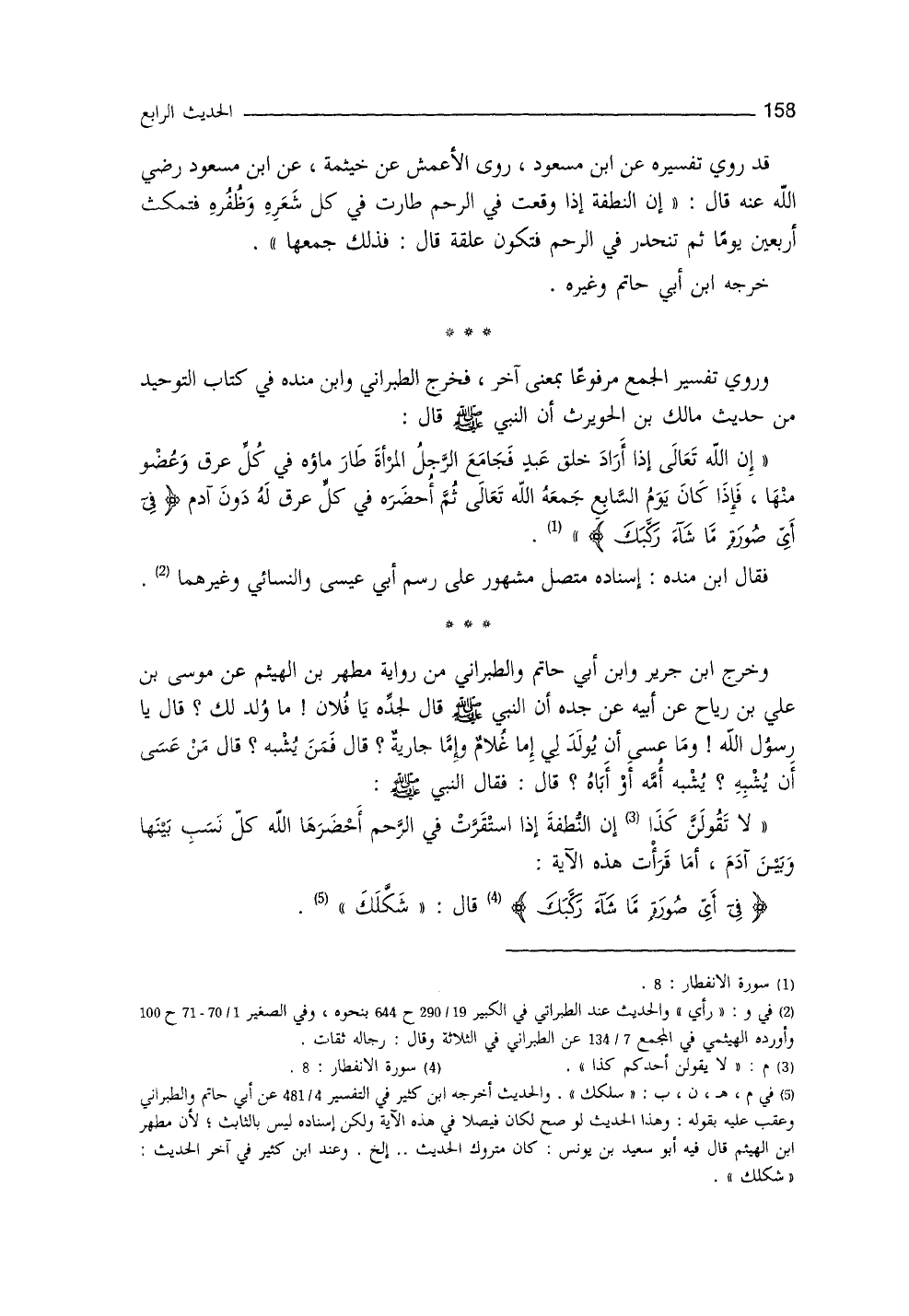 كتاب " التوحيد " من حديث مالك بن الحويرث: أنَّ النَّبيَّ - صلى الله عليه وسلم - قال: ((إنَّ الله تعالى إذا أرادَ خلقَ عبدٍ، فجامعَ الرَّجُلُ المرأةَ، طار ماؤهُ في كلِّ عرقٍ وعضوٍ منها، فإذا كانَ يومُ السابع جمعه الله، ثم أحضره كلّ عرق له دونَ آدم (¬2) : {فِي أَيِّ صُورَةٍ مَا شَاءَ رَكَّبَكَ} (¬3) ، وقال ابن منده: إسناده متصل مشهور على رسم أبي