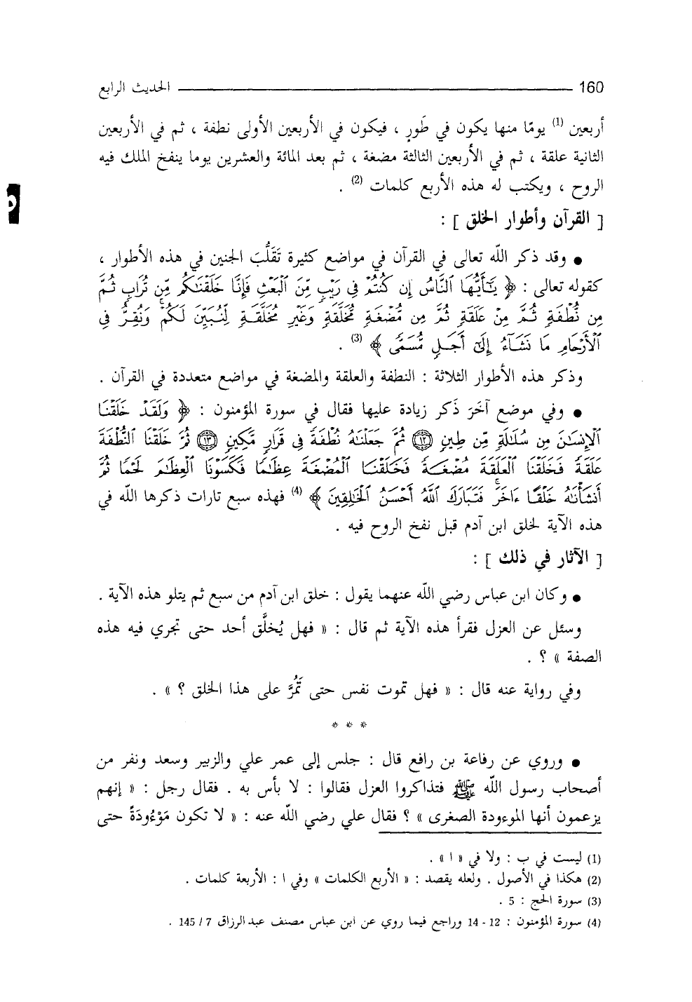 وذكر هذه الأطوار الثلاثة: النُّطفة والعلقةَ والمضغة في مواضع متعددةٍ من القرآن، وفي موضع آخر ذكر زيادةً عليها، فقال في سورة المؤمنين: {وَلَقَدْ خَلَقْنَا الإنْسَانَ مِنْ سُلالَةٍ مِنْ طِينٍ ثُمَّ جَعَلْنَاهُ نُطْفَةً فِي قَرَارٍ مَكِينٍ ثُمَّ خَلَقْنَا النُّطْفَةَ عَلَقَةً فَخَلَقْنَا الْعَلَقَةَ مُضْغَةً فَخَلَقْنَا الْمُضْغَةَ عِظَاماً فَكَسَوْنَا الْعِظَامَ لَحْماً ثُمَّ أَنْشَأْنَاهُ خَلْقاً آخَرَ فَتَبَارَكَ اللهُ أَحْسَنُ الْخَالِقِينَ} (¬2) .