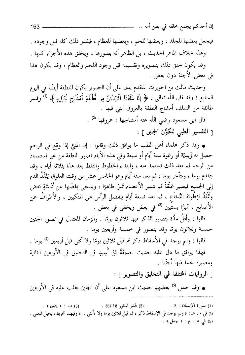 وحديث مالكِ بنِ الحويرث المتقدِّم يدلُّ على أنَّ التصويرَ يكونُ للنُّطفة أيضاً في اليوم السابع، وقد قال الله - عز وجل -: {إِنَّا خَلَقْنَا الإنْسَانَ مِنْ نُطْفَةٍ أَمْشَاجٍ} (¬1) وفسَّرَ طائفةٌ مِنَ السَّلَفِ أمشاجَ النُّطفةِ بالعُروقِ التي فيها (¬2) . قال ابن مسعود: أمشاجها: عروقها (¬3) .
