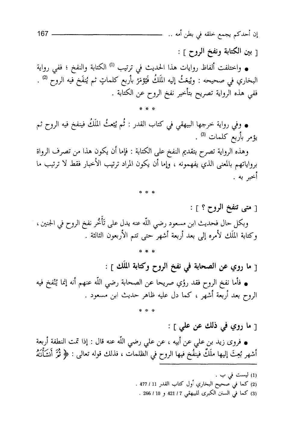 وبكل حالٍ، فحديثُ ابن مسعود يدلُّ على تأخُّرِ نفخِ الرُّوح في الجنين وكتابة الملك لأمره إلى بعد أربعة أشهر حتّى تتمَّ الأربعون الثالثة. فأمَّا نفخُ الرُّوح، فقد روي صريحاً عن الصَّحابة أنَّه إنَّما ينفخ فيه الروح بعد أربعة أشهرٍ، كما دلَّ عليه ظاهرُ حديث ابن مسعود. فروى زيدُ بنُ عليٍّ، عن أبيه، عن عليٍّ، قال: إذا تمَّتِ النُّطفة أربعة أشهر بُعِثَ إليها مَلَكٌ، فنَفَخَ فيها الروح في الظلمات، فذلك قولُه تعالى: {ثُمَّ أَنْشَأْنَاهُ