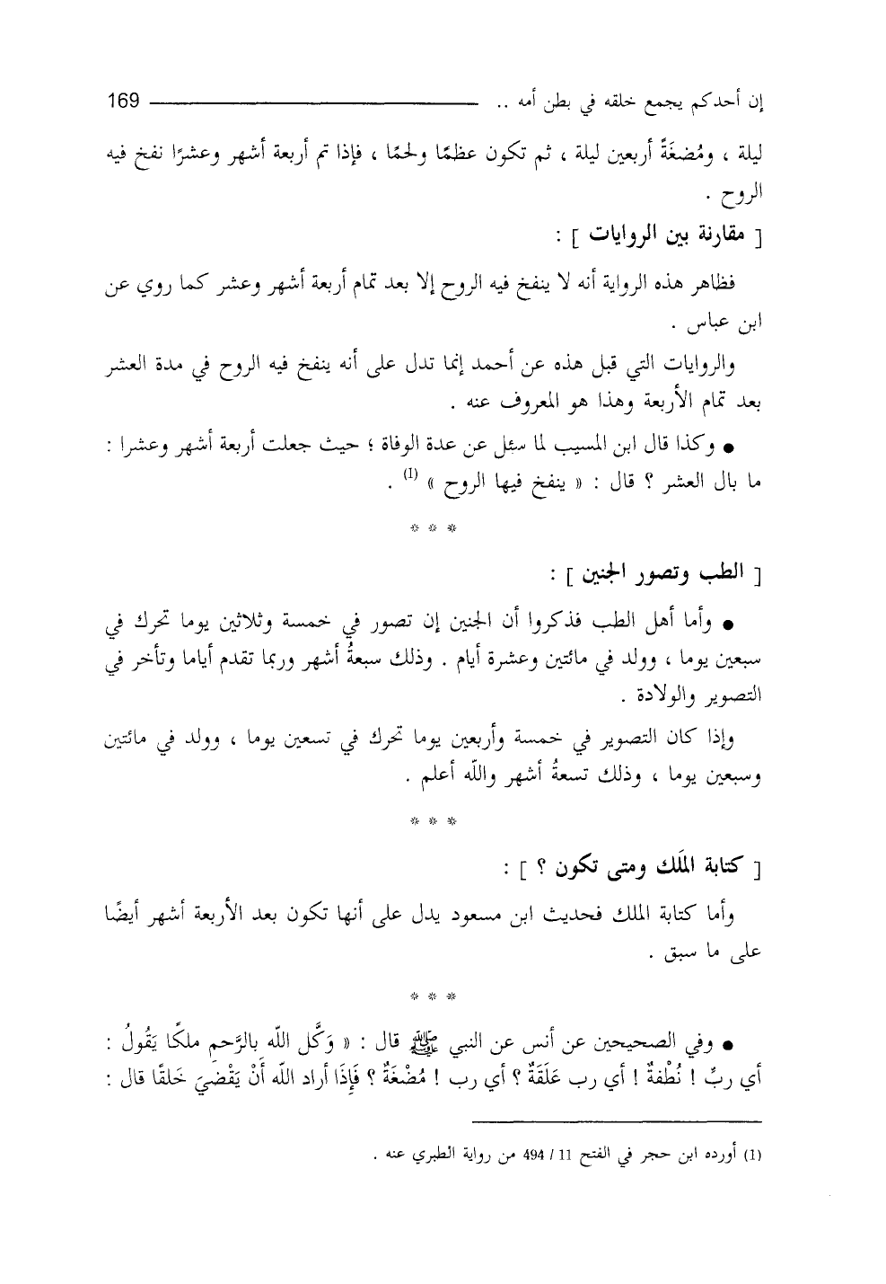 فيه الرُّوح في مدَّة العشر بعد تمام الأربعة، وهذا هو المعروف عنه، وكذا قال ابن المسيب لمَّا سُئِلَ عن عِدَّةِ الوفاة حيث جعلت أربعة أشهر وعشراً: ما بال العشر؟ قالَ: ينفخ فيها الروح.