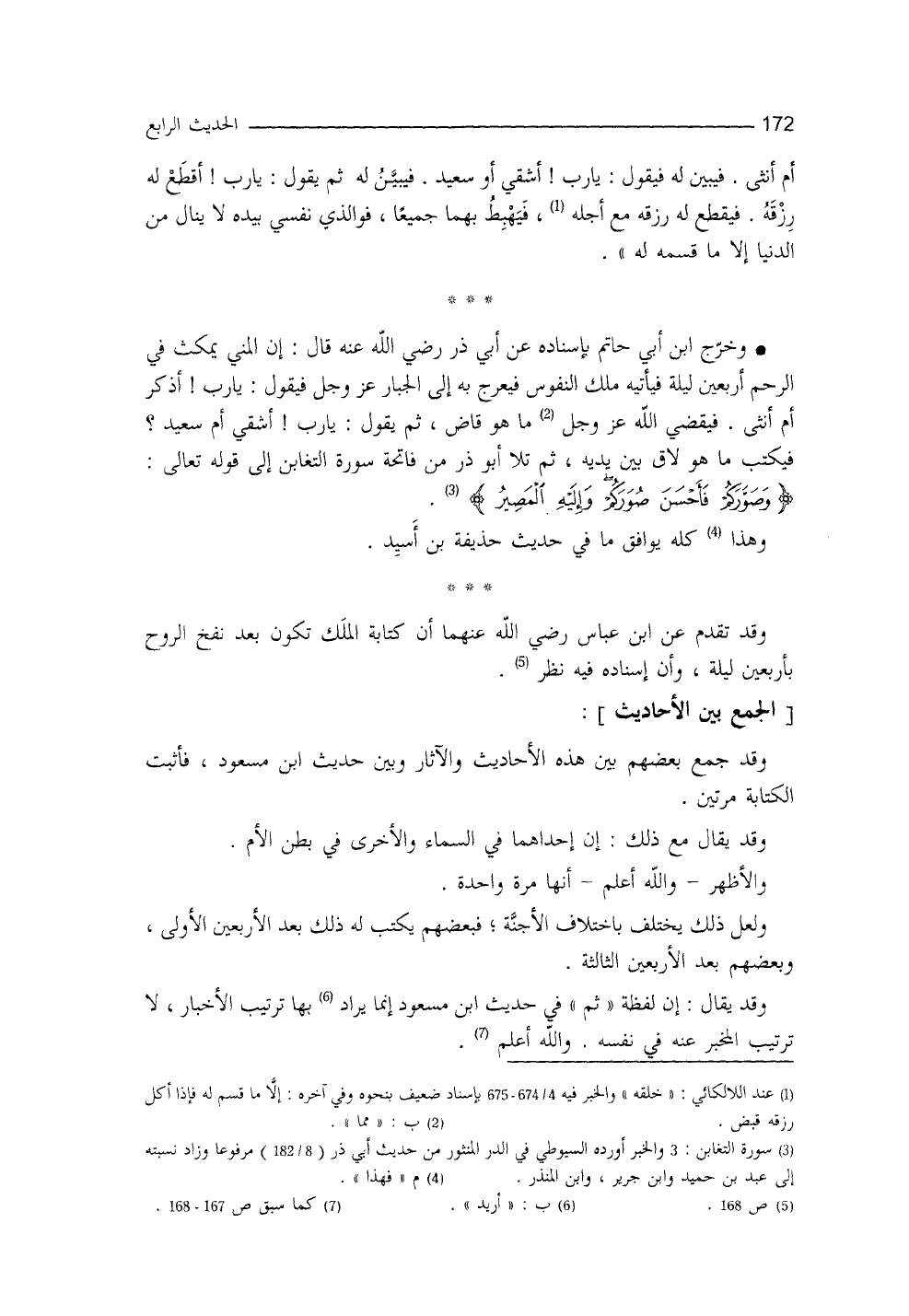 وقد جمع بعضُهم بين هذه الأحاديث والآثار، وبينَ حديث ابن مسعود، فأثبت الكتابة مرَّتين، وقد يقال مع ذلك: إنَّ إحداهما في السماء والأخرى في بطن الأم، والأظهر - والله أعلم - أنَّها مرَّة واحدة، ولعلَّ ذلك يختلف باختلاف الأجنَّة، فبعضهم يُكتب له ذلك بعد الأربعين الأولى، وبعضهم بعد الأربعين الثالثة (¬5) . (¬6)