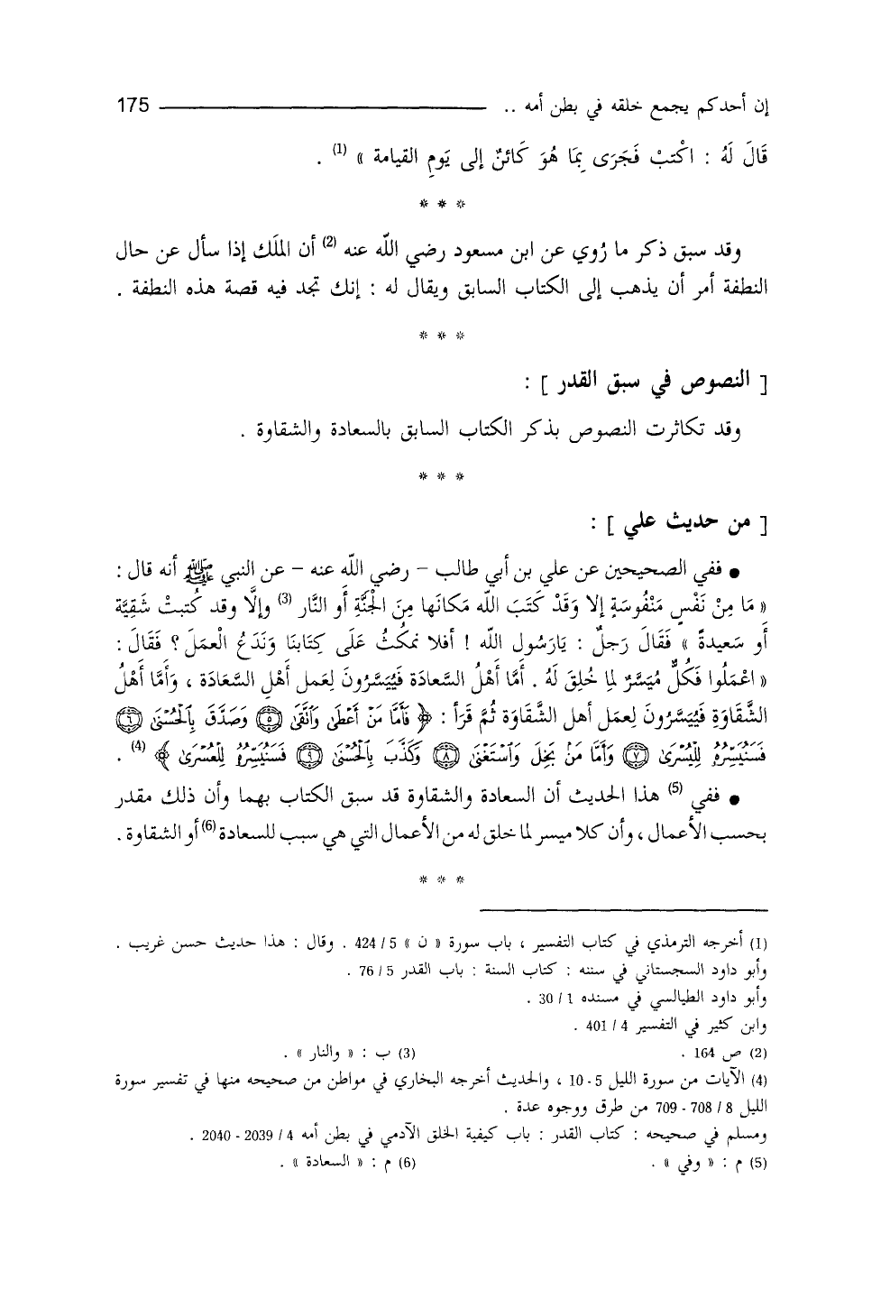 وقد سبق ذكرُ ما رُوي عن ابنِ مسعودٍ - رضي الله عنه -: أنَّ المَلَكَ إذا سأل عن حالِ النُّطفة، أُمِر أنْ يذهبَ إلى الكتاب السابق، ويقال له: إنَّكَ تجِدُ فيه قصَّةَ هذه النُّطفة، وقد تكاثرت النُّصوص بذكرِ الكتابِ السابقِ، بالسَّعادة والشقاوة،
