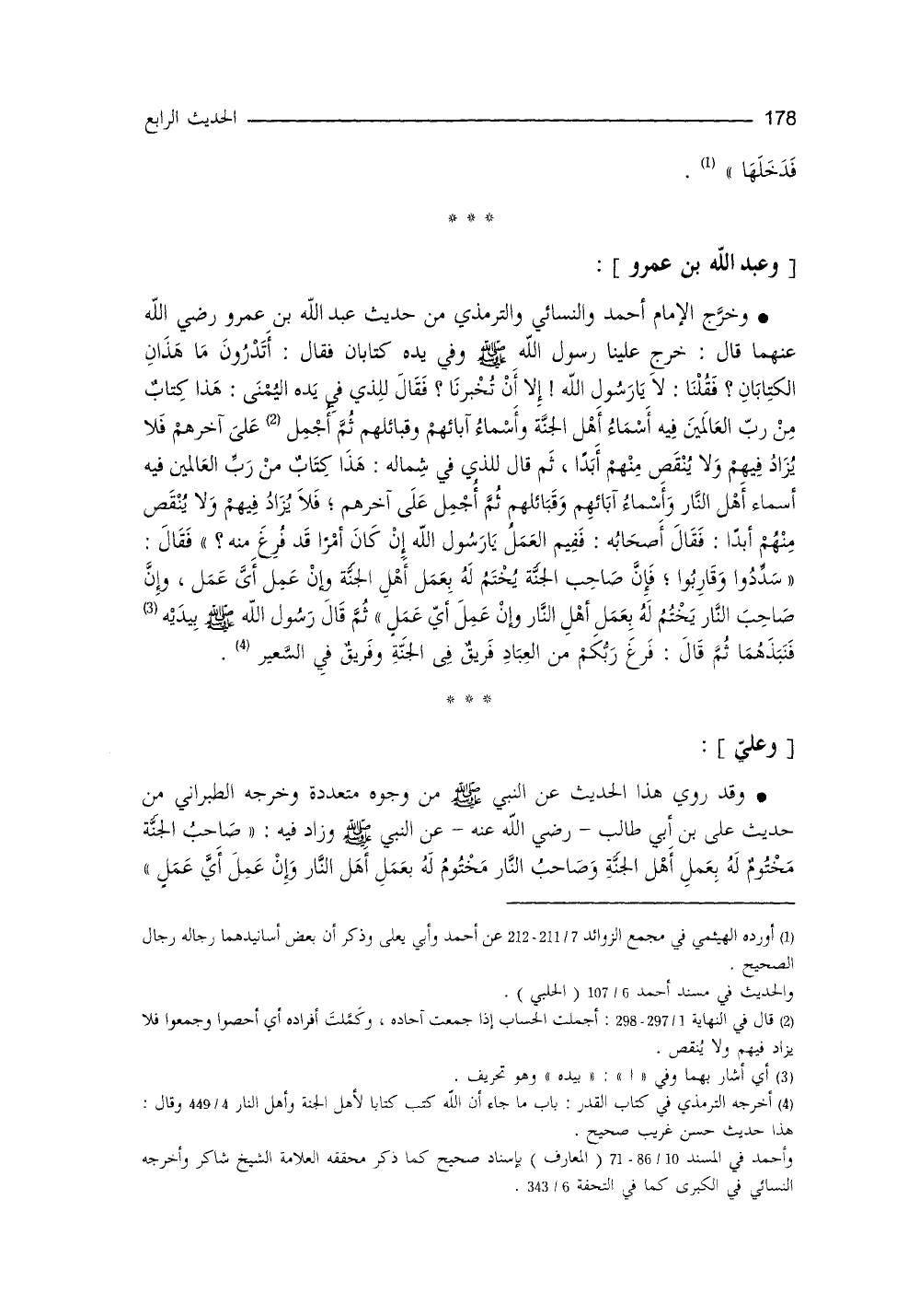 وخرَّج أحمد، والنسائيُّ، والترمذيُّ (¬2) من حديثِ عبد الله بنِ عمرٍو قال: خرج علينا رسولُ الله - صلى الله عليه وسلم - وفي يده كتابانِ، فقال: ((أتدرون ما هذان الكتابان؟)) ، فقلنا: لا يا رسول الله، إلاّ أنْ تُخْبِرنا، فقالَ للذي في يده اليمنى: ((هذا كتابٌ مِنْ ربِّ العالمين، فيهِ أسماءُ أهلِ الجنَّةِ، وأسماء آبائهم وقبائلهم، ثُمَّ أُجْمِل على آخرهم، فلا يُزاد فيهم، ولا يُنقصُ منهم أبداً)) ، ثُمَّ قالَ للذي في شماله: ((هذا كتابٌ من ربِّ العالمين فيهِ أسماء أهل النار وأسماء آبائهم وقبائلهم، ثُمَّ أُجْمل على آخرهم، فلا يُزاد فيهم ولا يُنقصُ منهم أبداً)) ، فقالَ أصحابُه: ففيم العملُ