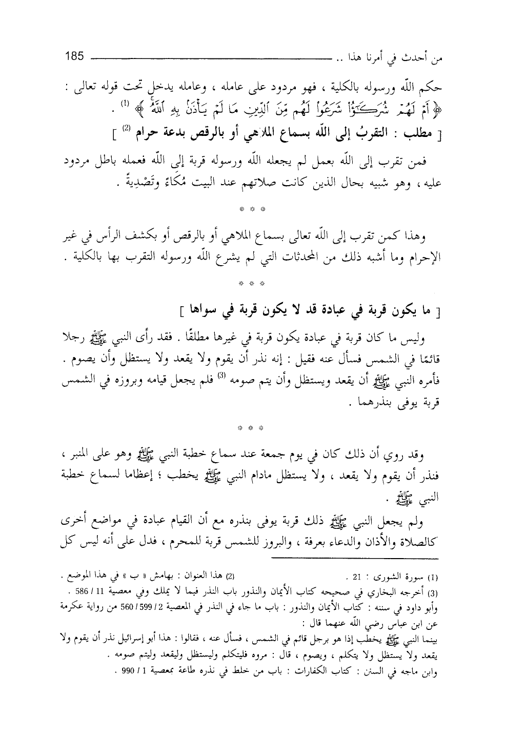 حكم (¬1) الله ورسوله بالكلية، فهو مردود على عامله، وعامله يدخل تحت قوله: {أَمْ لَهُمْ شُرَكَاءُ شَرَعُوا لَهُمْ مِنَ الدِّينِ مَا لَمْ يَأْذَنْ بِهِ الله} (¬2) ، فمن تقرَّب إلى الله بعمل، لم يجعله الله ورسولُه قربة إلى الله، فعمله باطلٌ مردودٌ عليه، وهو شبيهٌ بحالِ الذين كانت صلاتُهم عندَ البيت مُكاء وتصدية، وهذا كمن تقرَّب إلى الله تعالى بسماع الملاهي، أو بالرَّقص، أو بكشف الرَّأس في غير الإحرام، وما أشبه ذلك من المحدثات التي لم يشرع الله ورسولُه التقرُّب بها بالكلية.