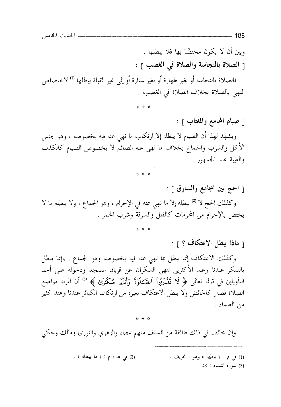 الجماعُ، وإنَّما يبطل بالسُّكر عندنا وعند الأكثرين، لنهي السَّكران عن قربان المسجد ودخوله على أحدِ التأويلين في قوله تعالى: {لا تَقْرَبُوا الصَّلاةَ وَأَنْتُمْ سُكَارَى} (¬2) أنَّ المرادَ مواضع الصلاة، فصار كالحائض، ولا يبطلُ الاعتكافُ بغيره من ارتكابه الكبائر عندنا وعندَ كثيرٍ من العلماء، وقد (¬3) خالف في ذلك