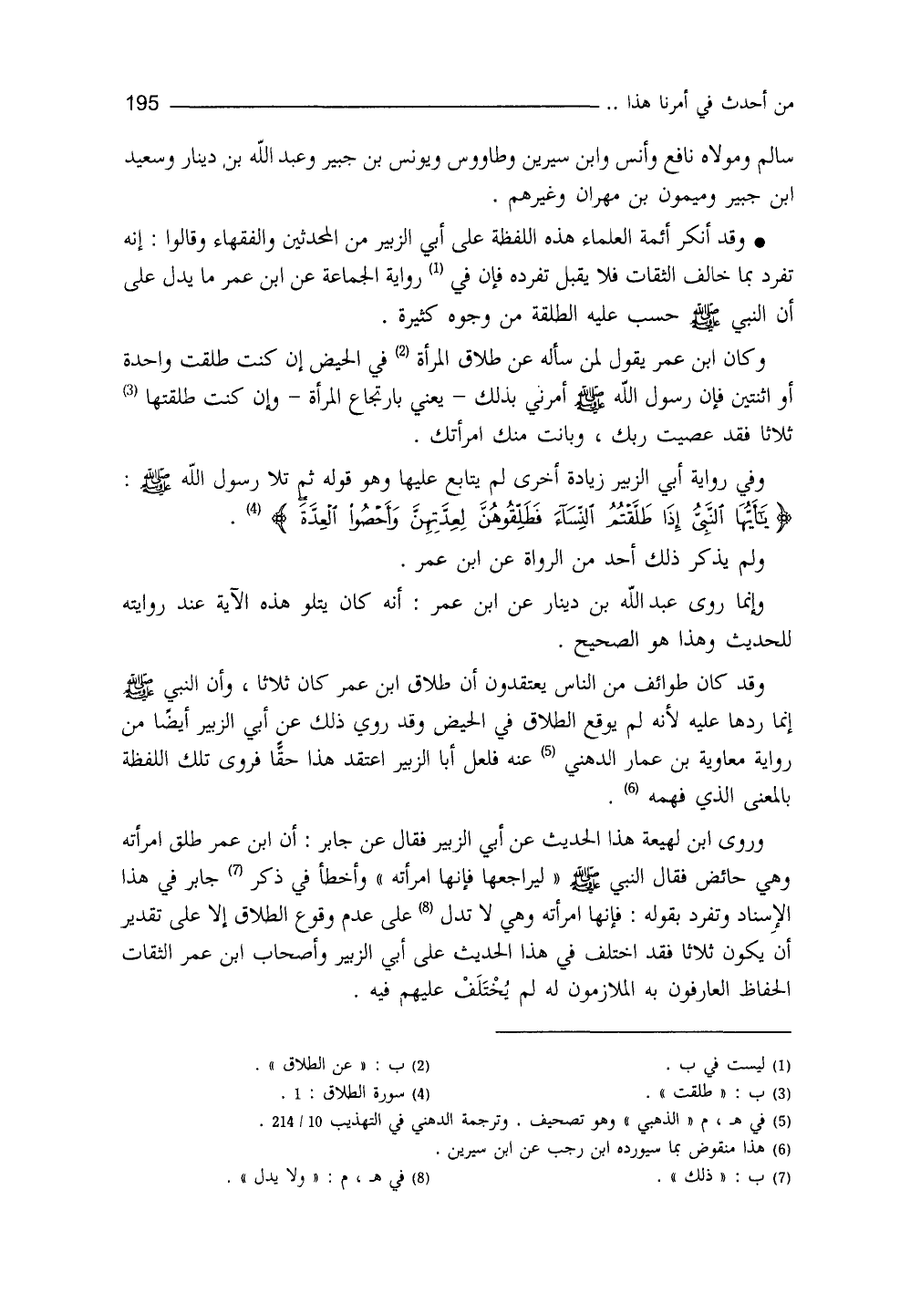 وقد أنكر أئمة العلماء هذه اللفظة على أبي الزبير من المحدثين والفقهاء، وقالوا: إنَّه تفرَّد بما خالف الثِّقات، فلا يُقبل تفرّده، فإنَّ في رواية الجماعة عن ابن عمر ما يدلُّ على أنَّ النَّبيَّ - صلى الله عليه وسلم - حسب عليه الطلقة من وجوه كثيرة، وكان ابنُ عمر يقول لمن سأله عن الطلاق في الحيض: إنْ كنتَ طلَّقتَ واحدةً أو اثنتين (¬1) ، فإنَّ